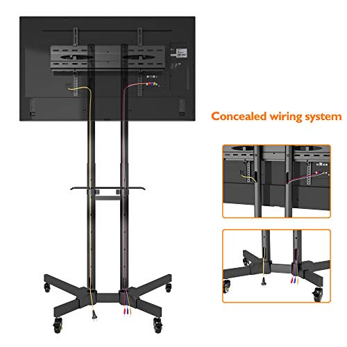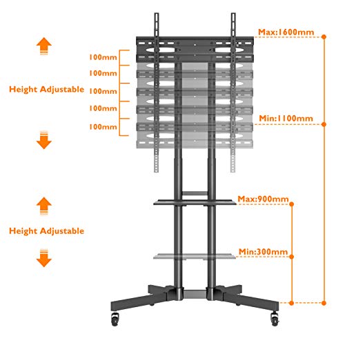 Diese vielseitige TV Halterung eignet sich hervorragend für den kommerziellen Einsatz in Büros, Schulen, Hotels, Flughäfen, Laboratorien, Ausstellungen, Krankenhäusern usw.. Die Halterung ist geeignet für die meisten Flachbildschirm/LCD/LED-TVs von 32 bis 65 Zoll, mit einer maximalen Tragfähigkeit von 50 kg (110 lbs). Die höhenverstellbare und neigbare Stahlhalterung unterstützt den TV-Mount, damit Sie den perfekten Blickwinkel finden können. Die breite Grundlage Konstruktion verhindert den Ständer von kippen. Kommt mit einem stabilen Medien Regal zu halten Ihren DVD Spieler oder andere AV Ausrüstung. Die TV Halterung ist mit vier hochleistungsfähigen Rollen, um den TV Karren von einem Ort zum anderen leicht zu bewegen; der eingebaute Gesperre erlaubt den Karren, stationär zu sein oder beweglich zu sein. Mit integriertem Kabel-Management-System können Sie die Drähte verbergen. Montage ist einfach; Lieferumfang beinhaltet Bedienungsanleitung, bietet eine vollständige Illustration der Beweglichkeit.