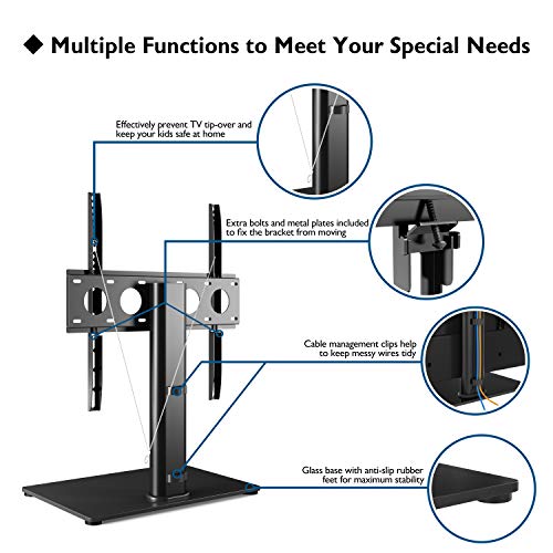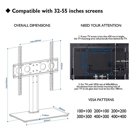 Der universaler TV Ständer is geeignet für TV-Geräte, PC-Monitore mit Bildschirmdiagonale 32 – 55 Zoll; Bildschirmaufnahme belastbar max. ca.40 kg; VESA Kompatibilität max.: 400 x 400 mm Der TV Ständer ist höhenverstellbar mit 3 Stufen für optimale Betrachtung. Das Sicherheitsglas hat eine Grundfläche und dient als Ort für ihre AV-Komponenten. Die Pads auf der Bodensatz verhindern das Kratzen auf den Oberflächen. Dieser Sockel TV Ständer ist aus hochwertigen Materialien gefertigt, ist sehr robust und langlebig.Mit der Kabelführung können Sie die Kabel zusammenführen. Somit sieht das Gesamtbild mit Ihrem Tisch ordentlich und sauber aus.Die Halterung auf dem TV Ständer ist abtrennbar, können als eine TV Wandhalterung werden sein. Einfach zu installieren. Mit Bedienungsanleitung und kostenfrei Montage Hardware.