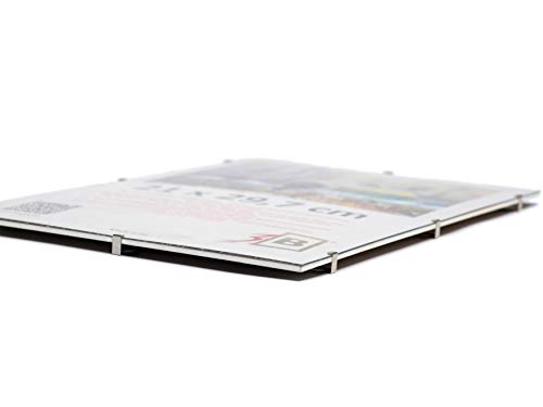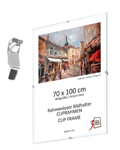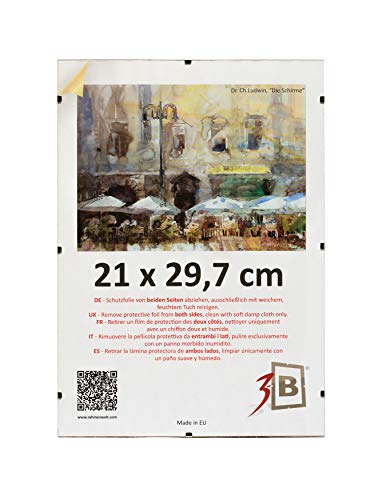 3-B: Cliprahmen / Bildträger / Rahmenloser Bildhalter mit Polyesterglas kann sowohl für Fotos, Plakate, Poster, Grafiken und Kunstdrucke als auch für Büroinfo sowie Kundeninfo genutzt werden. Jeder Bilderrahmen enthält eine MDF-Rückwand, eine LUMEX A-PET Platte und eine integrierte Aufhängung für Hoch- und Querformat. Der Bilderrahmen mit sg. Kunstglas ist eine sehr praktische Lösung, da er sowohl sehr leicht als auch ungefährlich und unzerbrechlich ist. Unsere Bilderrahmen statten wir mit einer hochwertigen Polyesterplatte, sogenanntem Polyesterglas oder Plexi, aus. Diese Platte wird im Herstellungsprozess (bei den Lieferanten) mit einer beidseitigen Schutzfolie bedeckt, die vor dem Einrahmen entfernt werden sollte. Wir möchten darauf hinweisen, dass die von uns verwendete Polyesterplatte praktischer und sicherer als Normalglas und zudem noch viel teurer als dieses ist. Darüber hinaus besitzt sie eine Transparenz, die mit der Transparenz eines Standardglases identisch ist und gleichzeitig weniger reflektiert. Auf den ersten Blick wirkt die Polyesterplatte sehr dünn, ist aber für den Einsatzzweck hervorragend geeignet. Nach dem Einrahmen des Posters oder Bildes und dem Aufhängen an der Wand kann man keinen Unterschied sehen, aber dank des geringen Gewichts braucht man zum Aufhängen keinen starken Haken und Dübel, sondern lediglich einen gut platzierten Nagel. Die meisten von Amazon angebotenen Clip-Rahmen mit sg. Kunstglas enthalten Acrylglas aus einer Acrylplatte. Polyesterglas ist ein viel teureres und deutlich besseres Material als Acrylglas. Im Gegensatz zur Acrylplatte weist die Polyesterplatte größere Biegsamkeit auf. Da Polyester ein sehr elastischer Kunststoff ist, kommt es nicht zu Beschädigungen an den Ecken. Darüber hinaus hat Polyesterglas eine bessere Transparenz. Erhältliche Bildgrößen: 15 x21cm (A5), 21 x 29,7 cm (A4), 29,7 x 42 cm (A3), 50×70 cm, 60×80 cm und 70×100 cm. In EU hergestellt! Produkte mit dem besten Preis-Leistungverhältnis!