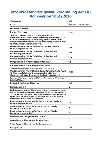 BeschreibungÖKOMix – Perfekter Schutz für jede FaserÖKOMix Technologie – Schutz und Sauberkeit, Faser für Faser ÖKOPower Programm – Perfekte Reinigunsleistung in nur einer Stunde ProSense® Technologie – Zeit-, Wasser- und StromsparendPlusDampf Funktion – bis zu ein Drittel weniger Falten in der WäscheÖkoInverter Motor – Langlebig und äußerst sparsam im VerbrauchÖKOMix TechnologieProSteam® TechnologieProSense® TechnologieFassungsvermögen: 1 -8,0 kgMax. Schleuderdrehzahl: 1400 U/min* 50 % sparsamer als der Grenzwert zur Energieeffizienzklasse A+++ gemäß EU-Richtlinie 1061/2010ProTex SchontrommelÖko Inverter Motor – Extrem leiser Betrieb und längere Lebensdauer DirectSpray WaschtechnikWaschprogramme: Koch-/Buntwäsche-Pflegeleicht-Feinwäsche-Wolle/Seide Handwäsche-Auffrischen mit Dampf-ÖKOPower-Anti-Allergie-20 min – 3 kg-Outdoor/Imprägnieren-JeansHandwaschprogramme für handwaschbare WolltextilienAqua Control System mit AlarmWassermengen-SensorUniversal Fleckenoption Technische Daten Bezeichnung: AEG L8FE74485Energieeffizienzklasse Skala von A+++(niedriger Verbrauch) bis D(hoher Verbrauch): A+++Schleuderwirkungsklasse (Skala von A(besser) bis G(schlechter): BMaximale Beladung in kg im Waschprogramm 40°/60°C Baumwolle: 8,0Schleuderdrehzahl in U/min: 1400Maximale Geräuschentwicklung beim Waschen in Dezibel: 51Maximale Geräuschentwicklung beim Schleudern in Dezibel: 75Energieverbrauch in kWh bei 220 Waschzyklen pro Jahr: 97Wasserverbrauch in Litern bei 220 Waschzyklen pro Jahr: 0Abmessungen (HxBxT) in mm: 850x600x500