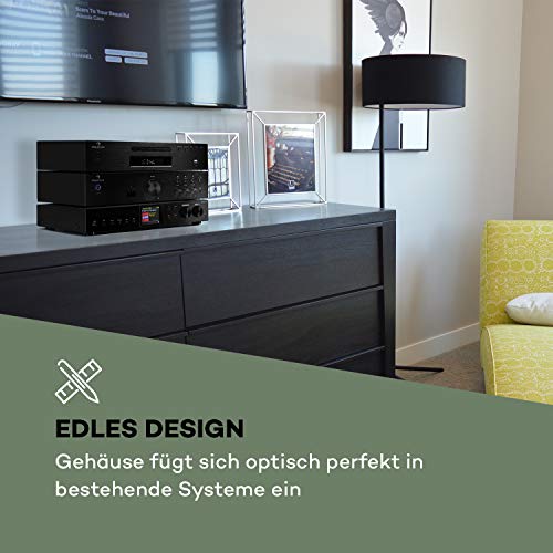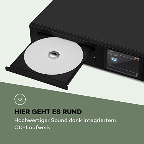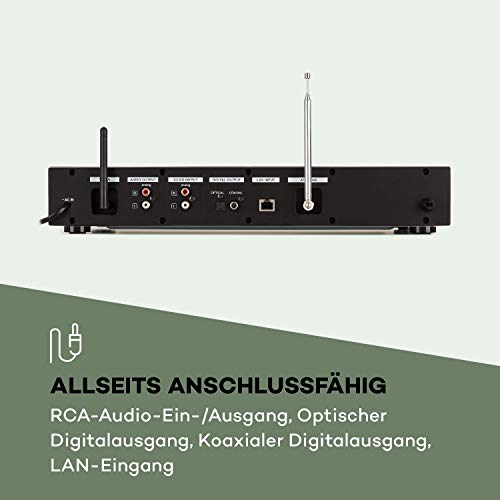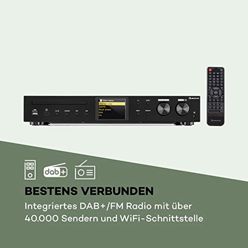 HiFi-Receiver inklusive Internet/DAB+/ FM Radio, CD-Player und USB-Anschluss fürMP3-Wiedergabe.Spotify Connect für drahtloses Audio-Streaming sowie Multi-Room-Funktion und bequemeSteuerung per App.Übersichtliches 3,2″ TFT Farbdisplay, praktische Infrarot-Fernbedienung und ein edlesMetallgehäuse mit einer Front aus Edelstahl.Der auna iTuner CD HiFi-Receiver ist dank vielzähliger Funktions- undAnschlussmöglichkeiten die perfekte Erweiterung vorhandener HiFi-Systeme. Dervielseitige Alleskönner mit integriertem Internet/DAB+/FM Radio empfängt bis zu40.000 Sender und verfügt über integriertes WiFi, einen klassischen CD-Player, einenUSB-Anschluss zur MP3-Wiedergabe sowie über einen LAN-Eingang.Top Features: Bestens verbunden: integriertes Internet/DAB+/FM Radio mit über 40.000 Sendern undWiFi-Schnittstelle Extra smart: durch Multiroom-Funktion und Spotify Connect Infinite Music: integrierter CD-Player sowie USB-Port für grenzenloseMusikwiedergabe Drahtlos und bequem: UNDOK-App sorgt für eine komfortable Bedienung Allseits anschlussfähig: 1 x RCA-Audio-Eingang, 1 x RCA-Audio-Ausgang, 1 xOptischer Digitalausgang, 1x Koaxialer Digitalausgang, 1 x LAN-EingangEigenschaften: Anschlüsse: 1 x RCA-Audio-Eingang, 1 x RCA-Audio-Ausgang, 1 x OptischerDigitalausgang, 1x Koaxialer Digitalausgang, 1 x LAN-Eingang Internet/DAB+/FM Radio CD-Player Spotify Connect UNDOK-App USB-Anschluss für MP3-Wiedergabe Über 40.000 Sender Übersichtliches 3,2″ TFT Farbdisplay Stromversorgung: 230 V ~ | 50 HzLieferumfang: 1 x HiFi-Receiver 1 x FernbedienungAbmessungen: Maße: ca. 43,4 x 7,2 x 29,5 cm (BxHxT) Netzkabel: ca. 1,4 m Länge Gewicht: ca. 2,69 kg