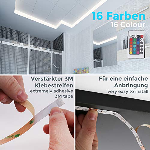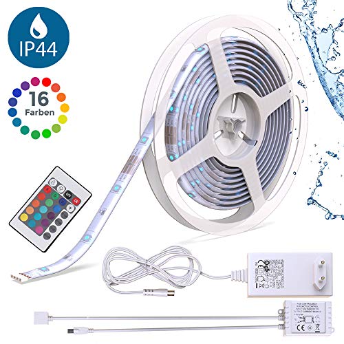 B.K.LICHT: Leuchten für helle KöpfeLED Lichtband Ceres – angenehme Atmosphäre für Drinnen und Draußen Das farbenfrohe RGB Lichtband bietet mit insgesamt 150 LEDs ein faszinierendes Lichtspiel. Die Lichterkette ist spritzwassergeschützt, so dass sie individuell in Ihren Innenräumen oder im Außenbereich eingesetzt werden kann. Besonders ansprechend ist das Band, wenn Sie mit diesem Ihre Terrasse oder Ihr Badezimmer beleuchten. Durch die Selbstklebefunktion lässt sich das Lichtband einfach anbringen. Vier Lichtmodi bieten viel Abwechslung für die Beleuchtung: Flash: Schneller Farbwechsel Strobe: Pulsierendes Licht Fade: Sanfte Farbwechsel mit Dunkelphasen Smooth: Nahtlose Farbübergänge Wichtige Produktdetails: Eine Fernbedienung zur einfachen Steuerung ist im Lieferumfang enthalten. Der LED Streifen besitzt die Schutzart IP44, das Netzteil IP20. Produktmaße: 5.000x10x3mm (LxBxH) Weitere Vorteile: Umweltfreundlich Einfache Montage Kein Summton Gleichmäßige Lichtverteilung Hohe Farbwiedergabe