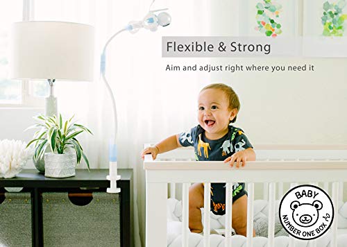 Sie müssen nicht mehr versuchen, die Kamera auf dem Rand de Kinderbetts zu balancieren oder zurück gehen, um die Kamera anzupassen. Der Flexxicam-Babykamerahalter von Number One Box ist ein universeller, robuster und flexibler Babykamerahalter. Es hat Klemmen mit Silikonschutz, die die meisten Baby-Kameras mit einem quadratischem, rechteckigem oder rundem Sockel/Ständer weniger als 9,6 cm breit und 3,8 cm hoch, halten können. Dieser Baby-Kamerahalter bietet eine hervorragende und sichere Sicht auf Ihr Baby. Dieser Halter ist einfach zu montieren und kann an Möbel von 0 bis 7 cm Dicke befestigt werden und flexibel gebogen, gedreht und positioniert werden, in 360 Grad. Folgen Sie den Montage-Anweisungen (evtl. nicht in deutscher Sprache). Platzieren Sie die Flexxicam-Kamerahalterung und Kamera nicht direkt über dem Bett Ihres Kindes. Das tragbare Design erlaubt es, sie bei Übernachtungen oder Urlaub mitzunehmen. Es ist verpackt in einer Karton-Box, wo es gefaltet werden kann. Die Gesamtlänge des Halters ist 85 cm. Für besseres Biegen und eine lange Lebensdauer wurde ein solides Kabel aus Aluminium-Magnesium-Legierung verwendet. Kann eine Kamera von bis zu 0,3 kg halten. Verfügbar in weißer und blauer Farbe. – Kamera nicht im Lieferumfang enthalten.