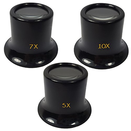 Uhrmacherlupe 3-tlg. Set mit 5, 7 & 10-facher Vergrößerung Diese Uhrmacherlupen zeichnen sich durch ihre hohe Stabilität und Bruchfestigkeit aus. Zudem bieten die Linsen stets einen klaren Durchblick und sind kratzfest. Details: – Durchmesser Linse: 20 mm – Durchmesser oben: 25 mm – Durchmesser unten: 39 mm – Gesamthöhe: 30 mm – Gehäusematerial: Extra stabiler Kunststoff – Material Linse: Glas – Farbe: schwarz – Produktart: Uhrmacherlupe – Warengruppe: Vergrößerungslupen Besonderheit: Keine scharfen Kanten, kratzfest, besonders leicht & stabil [Update 31.05.19: Die Vergrößerungen unserer Uhrmacherlupen, wurden aufgrund von Kundenfeedbacks weiterentwickelt und optimiert.]