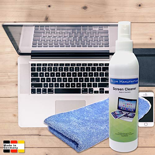 Blum Manufaktur – Bildschirmreiniger Made in Germany – Ein Qualitätsprodukt für höchste Ansprüche.Perfekte Reinigung aller Bildschirme und Displays.DisplayreinigerEntfernt mühelos Fingerabdrücke, Schlieren, Staub und sonstigen Schmutz.Sehr angenehmer Geruch, verflüchtigt sich sehr schnell.TFT MonitorreinigerEignet sich auch hervorragend um TFT Monitore zu reinigen.Matte Bildschirme werden nicht angegriffen dank schonender Formel.EigenschaftenUmweltfreundlich, Tenside biologisch abbaubar, ohne Weichmacher ohne Komplexbildner, ohne aggressive Lösemittel, keine Reiz- oder Ätzwirkungennicht brennbar, keine ätzende Dämpfe, sparsam im Verbrauch hohe Reinigungskraft, streifenfreie ReinigungInhaltsstoffangabe5% Isopropanol, < 5% Anionische TensideMikrofasertuchMikrofaser aus 80% Polyester und 20% Polyamid. Das Tuch ist extra weich und extra dick.Hervorragend für eine schonende Reinigung hochsensibler und glatten Oberflächen.Wiederverwendbar und bis zu 95° waschbar (ohne Weichspüler).Anwendung1. Zu reinigendes Gerät ausschalten und abkühlen lassen.2. Groben Schmutz entfernen.3. Bildschirmreiniger auf das Microfasertuch sprühen.4. Vorsichtig und ohne Druck das Display reinigen.5. Bei hartnäckigem Schmutz Vorgang wiederholen.Wichtig: Bitte achten Sie auf die Reinigungshinweise des Geräteherstellers.AnwendungsbereicheOb im Büro, zu Hause, im Geschäft, bei der Messe, unterwegs - immer ein sauberer Bildschirm.Für Computer, eBook Reader, Laptop, Notebook, Tablet, Smartphone und vieles mehr.