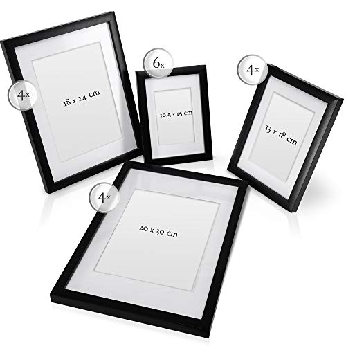 bomoe Bilderrahmen-Set für Collagen aus MDF Holz und bruchsicherem Plexiglas Sie wollen eine Lösung um Ihre Wände stilvoll zu dekorieren, Ihre Fotos aufzuhängen oder ihre gemalten Bilder immer in Sichtweite zu haben? Mit dem Bilderrahmen Set von Bomoe haben Sie die perfekte Lösung gefunden. Verteilen Sie die Bilderrahmen Collage doch in verschiedenen Zimmern oder machen Sie eine große Collage daraus. Ob quer oder hochkant, mit den mitgelieferten Bildern oder eigenen, Sie können individuell entscheiden wie Sie dieses Fotorahmen Set am besten nutzen wollen. Zudem sind die Bilderrahmen mit Standfüßen ausgestattet, sodass sie ohne Probleme auch auf ihren Tischen oder Möbeln Platz nehmen können. Die Bomoe Bilderrahmen Sets bestehen aus MDF-Holz und bruchsicherem, beidseitig foliertem Plexiglas. Somit ist sichergestellt, dass Ihre Bilder, seien es Fotos, Kunstwerke oder selbst gemalte Bilder, langfristig vor Schmutz geschützt sind. Zu diesem Set gehören Passepartouts für alle Bilderrahmen. So können Sie auch kleinere Bilder in die Fotorahmen integrieren während sie den Edlen Look behalten. Mit den Passepartouts kann man die folgenden Größen verändern: ohne PPT mit PPT 20×30 cm 15×20 cm 18×24 cm 13×18 cm 13×18 cm 9×13 cm 10×15 cm 7×10 cm Details: Marke: Bomoe Serie: Passion Lieferumfang: 6x 10,5x15cm/4x 13x18cm/4x 18x24cm/4x 20x30cm Material: MDF-Holz und Plexiglas Inklusive Passepartouts für alle Rahmen