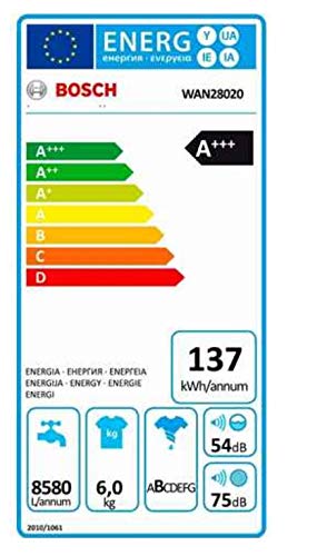 Die Waschmaschine Bosch WAN28020 eignet sich mit einem Fassungsvermögen von 6 kg optimal für eine größere Familie. Mit zahlreichen Waschprogrammen bleiben keine Wünsche offen. Die Bedienung der WAN28020 gestaltet sich durch die Vollelektronische Einknopf-Bedienung kinderleicht. Die Restzeit hat man mit dem großen LED-Display immer im Blick. Auch in puncto Sicherheit glänzt die WAN28020 mit AquaStop-Funktion, Schaumerkennung und einer Kindersicherung. Mit einem Verbrauch von nur 137 kWh Strom und 8580 Litern an Wasser pro Jahr zählt die WAN28020 zur Energieeffizienzklasse A+++.