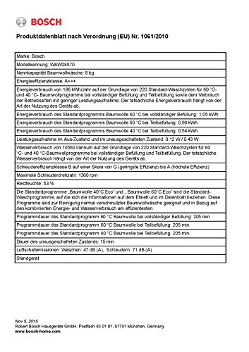 Technische DatenBezeichnung: Bosch WAW28570Energieeffizienzklasse Skala von A+++(niedriger Verbrauch) bis D(hoher Verbrauch): A+++Schleuderwirkungsklasse (Skala von A(besser) bis G(schlechter): BMaximale Beladung in kg im Waschprogramm 40°/60°C Baumwolle: 8.0Schleuderdrehzahl in U/min: 1360Maximale Geräuschentwicklung beim Waschen in Dezib