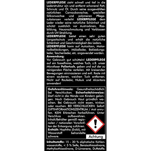 LEDERPFLEGE zieht schnell und tief in die Lederstruktur ein und entfernt schonend Fett, Schmutz und Öl.Durch seine ausgewählten natürlichen Carnaubawachse, speziellen Silikonwachse und polymeren Pflegesubstanzen verleiht LEDERPFLEGE dem Leder wieder seine natürliche Schönheit und schützt zusätzlich vor Rissbildung, Austrocknen, Neuanschmutzung und Verblassen durch UV-Strahlung.LEDERPFLEGE bietet einen sehr guten Langzeitschutz und erhält die natürliche Schönheit und Geschmeidigkeit des Leders.LEDERPFLEGE kann auf Autositzen, Motorradbekleidungen, Möbelleder, Bekleidungsleder, Taschenleder, etc. angewendet werden.Anwendung:Vor Gebrauch gut schütteln!LEDERPFLEGE auf ein fusselfreies, weiches Tuch, z.B. unser Mikrofaser Poliertuch, geben und auf der zu reinigenden Fläche verteilen.Mit kreisenden Bewegungen einmassieren und evtl.Reste mit einem sauberen, weichen Tuch entfernen.Nicht auf Rauleder, Nubuk und Alcantara anwenden!