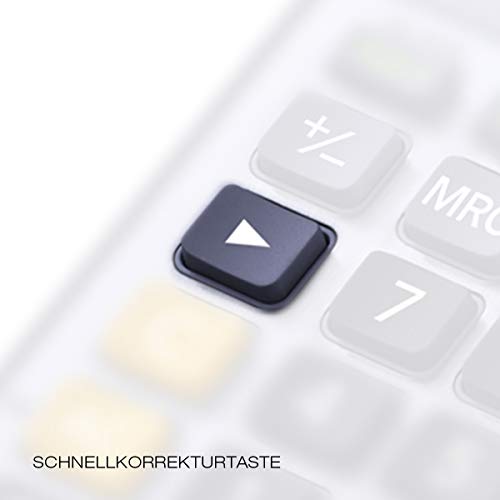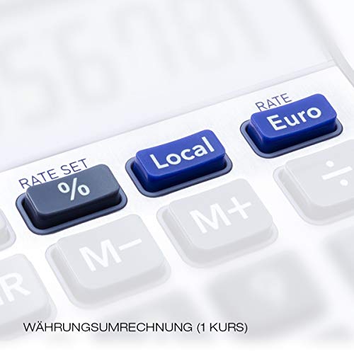 Mit angewinkeltem, extra großem LCD-Display. Solar- und Batteriebetrieb. Funktionen: Euro-Umrechnungsfunktion, , Tausenderunterteilung, 3-Tasten-Speicher, Backspace-Taste, Vorzeichenwechsel.Displayanzeige (ZeilenxZeichen) 1x 8ZeilenZeichen, Tiefe 147mm, Höhe 28.8mm, Doppelnulltaste Nein, Tausenderunterteilung Ja, Art der Hilfsenergie Batterie