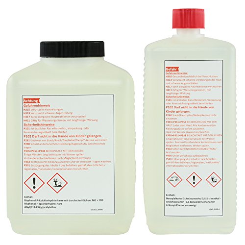 GFK Epoxidharz/Härter 55-45 Kristallglasklares Harz und Härter (100%Festanteil, also ohne Lösungsmittel, und ohne lästigen Gestank, sowie keine Verluste durch Ausdunsten beim Aushärten!) Profi Qualität Made in Germany Hervorragend geeignet für Sichtcarbonteile Zur Herstellung und Reparatur groß- und kleinflächiger Formteile und glasfaserverstärkter Formteile, wie Boote, Karosserien, Modellbau (zB. Stoßstangen, Motorradteile, Modellbau),usw. Geeignet für Aquarium-, Terrarium-, Teichbau Je nach Variante: 1,8Kg Set, 3 Kg Set, oder 10,1Kg Set (Das Gewicht beinhaltet Harz und Härter, z.B.: 6,6Kg Harz + 3,5Kg Härter = 10,1Kg) Verarbeitungszeit (Topfzeit) ca. 45-60 Min. Sehr hohe Biegefestigkeit Sehr hohe Bruchdehnung Sehr hohe Druckfestigkeit Sehr hohe Schlagzähigkeit Mischungsverhältnisse: Mischungsverhältnis (Gewichtsanteile) 100 gr. Harz / 55 gr. Härter Mischungsverhältnis (Volumenanteile) 100 ml Harz / 60 ml Härter Viskosität niedrigviskos Topfzeit (Verarbeitungszeit) 20°C ca. 45 – 60 min Beginn der Aushärtung ca. 60 min (temperaturabhängig) Endfest ca. 36 – 48 h (temperaturabhängig)