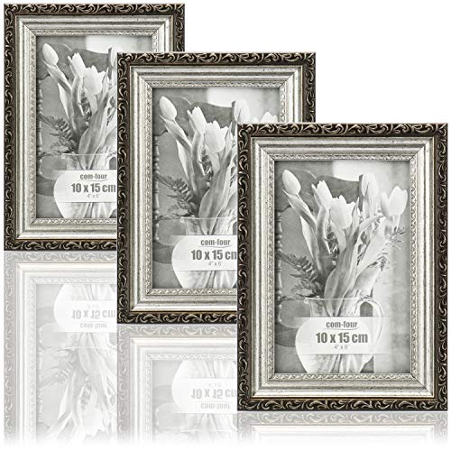 Bilderrahmen „Antik“ für die schönsten Fotos, Stilvoller Fotorahmen, Rahmen für Lieblingsbilder und Schnappschüsse Präsentieren Sie Ihre Lieblingsbilder in einem stilvollen Bilderrahmen im antiken Design! Schönes Design: Das antike Design mit modernem Touch sorgt für ein angenehmes, zeitloses Wohnambiente!Hingucker: Bilder und Fotos können nach Belieben ausgetauscht werden und sorgen somit für Abwechslung!Allrounder: Der Fotorahmen kann dank integriertem Standfuß sowohl vertikal, als auch horizontal aufgestellt werden!Cleveres Format: Die Größe des Rahmens eignet sich ideal um Portraits und Familienfotos in Szene zu setzen!Artikelmerkmale:• Maße Rahmen: 18,5 x 13,5 x 2 cm • Maße Bildformat: 10 x 15 cm (4″ x 6″) • Sichtbare Bildgröße im Rahmen: 13,5 x 8,5 cm • Material: Kunststoff • Farbe: silberfarben, dunkelbraun Kaufen Sie jetzt unsere Bilderrahmen und präsentieren Sie Ihre schönsten Fotos in einem ansprechenden Design! Bei COM-FOUR handelt es sich um eine Marke die beim Amt der Europäischen Union für geistiges Eigentum als Unionsmarke Nr. EU011758811 und Nr. EU014441703 eingetragen ist. Gemäß § 14 Abs. 2 MarkenG ist es Dritten untersagt, diese Marke im geschäftlichen Verkehr zu verwenden.