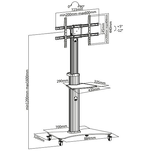 conecto TV Standfuß LM-FS01A für LCD/LED/Plasma Bildschirme von 37″ Zoll bis 70″ Zoll – 40kg Traglast, max. VESA 600x400mm, silbergrau/schwarz Der conecto Aluminium TV Standfuß LM-FS02G ist kompatibel mit LED, LCD- und Plasmafernsehern mit einem VESA Lochmaß von 200×200 bis 600×400 (ca. 37 bis 70 Zoll). Er besitzt eine maximale Tragkraft von 40kg und unterstützt die VESA Lochmaße 200×200, 300×300, 400×200, 400×400, 600×400. Der Standfuß besteht aus pulverbeschichtetem Aluminium und ist somit nicht für Korrosion anfällig. Vollbeweglich Spezielles Feature dieses Standfußes ist die 90° Drehbarkeit des angebrachten Fernsehers / Monitors (0° bis +90°) mit nur wenigen Handgriffen. Des Weiteren ist die Aufhängung des TV Geräts von +5° bis -12° neigbar, sodass der passende Neigungswinkel leicht einzustellen ist, z. B. um Reflexionen zu vermeiden. Die flexible Höhenverstellbarkeit des Standfußes ermöglicht eine fixe Arretierung in folgenden Höhen: 1200mm, 1250mm, 1300mm, 1350mm, 1400mm, 1450mm, 1500mm, 1550mm und 1600mm. Viele Features Für eine saubere und optisch ansprechende Kabelführung sorgt der integrierte Kabelkanal an der Rückseite des Standfußes. Die Mobilität wird durch vier Stück Schock-absorbierende 4″ Rollen an der Unterseite gewährleistet. So bleibt Ihr TV Gerät immer mobil und kann leicht in jeglicher Raumsituation platziert werden. Lieferumfang Im Lieferumfang des Standfußes befinden sich des Weiteren noch eine Ablagefläche mit einer max. Tragkraft von 5kg (z. B. für BluRay Player, etc.) sowie das komplette Montagematerial