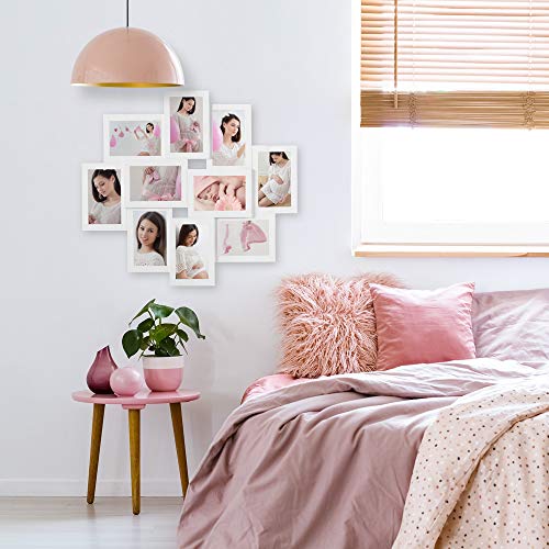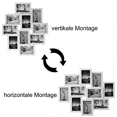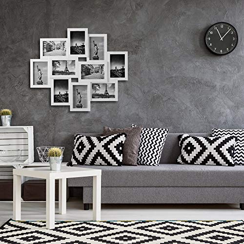 Moderne Bilderrahmen für Collagen – Halten Sie besondere Erinnerungen lebendig! Mit dem modernen Bilderrahmen können bis zu 10 Fotos im Format 10x15cm aufgehängt werden. Sie entscheiden dabei ob Sie ihn vertikal oder horizontal aufhängen. Durch die höhenversetzten Bildträger entsteht ein cooler 3D-Effekt und Ihre Bilder kommen bestens zur Geltung. Die Bilder lassen sich einfach einfügen und sitzen dank Fixierungen fest im Rahmen. Die Rückwand ist aus stabilem Hartfaser. Produktvorteile: Platz für 10 Fotos (10x15cm) einfacher Verschluss durch Drehklammer Bilder sitzen dank Fixierungen fest im Rahmen kann vertikal & horizontal aufgehängt werden cooler 3D-Effekt Gesamtmaße: (BxH) 59×50 cm Technische Daten: Gesamtmaße: (BxH) 59×50 cm Geeignet für: 10 Fotos (10x15cm) Material Rahmen: Kunststoff Material Glas: Klarglas Material Rückwand: Hartfaser Verschluss: Drehklammer Aufhänung: vertikal oder horizontal Farbe: weiß Lieferumfang: 1x Bilderrahmen Collage in weiß