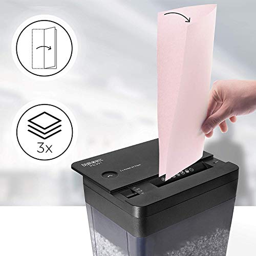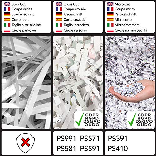 Duronic PS391 kompakter Aktenvernichter / Shredder – Micro Cut Zerkleinerung von 3 x gefaltetem A4 Blatt, mit 5 Liter Auffangbehälter Bei Duronic haben wir hart daran gearbeitet, einen der praktischsten Dokumente-Aktenvernichter auf den Markt zu bringen. Die neue allgemeine Datenschutzverordnung betrifft alle Unternehmen und ein Aktenvernichter im Büro ist unerlässlich, um die Informationen ihrer Kunden zu schützen. Deshalb nehmen wir bei Duronic die Sicherheit sehr ernst und haben diesen kompakten Aktenvernichter auf den Markt gebracht, der in der Lage ist, ein A4-Blatt Papier in nur 3 Sekunden in etwa 200 Teile zu zerkleinern. Das Micro-Cut-System verhindert, dass jemand das Dokument später neu zusammensetzt. Dank des integrierten 5-Liter-Behälters nimmt dieses Bürozubehör nicht viel Platz in Anspruch, sodass es entweder auf oder unter Ihrem Schreibtisch Platz hat. Eigenschaften des Aktenvernichters PS391 · Komprimieren Sie bis zu 3 A4-Blätter gefaltet oder 6 x A6 gleichzeitig · Micro-Cut 3 x 9 mm für mehr Sicherheit · Zerkleinern Sie ein Blatt in 3 Sekunden · Automatisches Ein- und Ausschalten durch Verschieben der Abdeckung · Direkt- und Umkehrfunktion · Ein / Aus-Schalter · Transparente 5L Auffangbehälter · Rolle, um Papierstau zu vermeiden