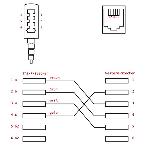 ecabo Telefonkabel TAE-F auf RJ 11-Stecker mit Import (Europa) Belegung Das ecabo Telefonkabel bieten Ihnen hervorragende Qualität zu einem unschlagbaren Preis-/ Leistungsverhältnis. Die Einsatzmöglichkeiten sind für alle Telefone mit der Internationalen oder Europäischen Belegung – schließen Sie Ihr Telefon direkt an Ihre Telefondose an, mit unseren Kabeln haben Sie immer die richtige länge parat. Einsatzvielfalt Mit dem ecabo TAE-F auf Westernstecker können Sie Ihr Telefon direkt mit Ihrer TAE-Anschlussdose verbinden. Wählen Sie die richtige Länge des Anschlusskabels und vermeiden Sie so Kabelschlaufen die unteranderem zu Stolperfallen führen können. Kompatibilität Das ecabo Telefonkabel bietet eine maximale Kompatibilität. Egal von welchem Hersteller oder Marke der Telefone sie müssen nur der Internationalen Belegung entsprechen, mit diesem Telefonkabel gibt es kaum Einschränkungen. Spezifikationen Das Kabel ist 4 Adrig aufgebaut. Die Belegung der Stecker sind: TAE-F Stecker Pin 1 (A), Pin 2 (B), Pin 3 (W) und Pin 4 (E) auf RJ11 Westernstecker Pin 3 (A), Pin 4 (B), Pin 2 (E) und Pin 5 (W) (6P4C) beachten Sie das Belegungsbild. Länge: 10,0 m Stecker A: TAE-F Stecker B: RJ11 Farbe: schwarz Kabelmantel: Kunststoff Aufbau: 4-adrig flach Adern Material: Kupfergemisch Stecker Material: Kunststoff Kontaktfläche TAE/RJ11: vernickelt / vergoldet Gehäusefarbe TAE/RJ11: schwarz / transparent