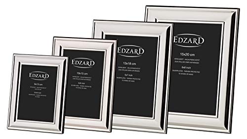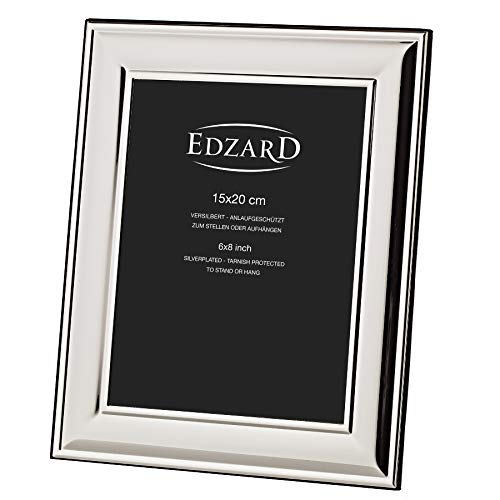 Wundervolle Momente festhalten und immer wieder durchleben: Fotografien und Bilder bieten uns die Möglichkeit Erinnerungen, Familie, Freunde und liebgewonnenes stets um uns zu haben. Sie bieten eine tolle, individuelle Note in jedem Zuhause oder ein wenig Privatheit im beruflichen Umfeld. Um ihre schönsten Fotos gekonnt in Szene zu setzen bedarf es eines besonderen Bilderrahmens wie etwa Sunset aus dem Hause EDZARD. Die Rahmen sind dank eines schlichten, zeitlosen Profils und der edlen Versilberung ein Highlight in jeder Wohnung oder jedem Büro. Dank des besonderen Anlaufschutzes bedürfen die Produkte von EDZARD keiner lästigen Pflege. Aufwändiges Putzen oder Polieren ist entsprechend nicht nötig. Auch die raffinierten und flexiblen Möglichkeiten der Aufhängung und -stellung sind ein besonderes Merkmal dieser Fotorahmen. Sunset lässt sich im Hoch- und Querformat an die Wand hängen oder aufstellen. In vier Größen, 9 x 13 cm, 10 x 15 cm, 13 x 18 cm sowie 15 x 20 cm, ist die Serie Sunset zu erhalten. Verschönern Sie Ihr Büro, Zuhause oder verschenken Sie Sunset mit tollen Fotos zu besonderen Anlässen und überzeugen Sie sich jetzt selbst von den wunderbaren Rahmen aus dem Hause EDZARD!- PREMIUM QUALITÄT: Die Bremer Silberwarenmarke EDZARD designed und produziert Silberwaren seit 1975. Die Marke ist spezialisiert auf hochwertig versilberte und anlaufgeschützte Fotorahmen. Solide massive Herstellung in edler und exzellenter Verarbeitung.- PFLEGELEICHT DANK ANLAUFSCHUTZ: Alle Rahmen von EDZARD sind mit einem speziellen Anlaufschutz versehen, für die Pflege reicht hin und wieder ein feuchtes Tuch.- DAS PERFEKTE GESCHENK: Dieser versilberte und hochglanzpolierte Bilderrahmen eignet sich genial zum Geburtstag, Kommunion, Konfirmation, Firmung, Taufe, Verlobung, Muttertag, Vatertag, Hochzeit aber auch für Ostern und Weihnachten. Der Samtrücken macht ihn besonders edel.- VIELSEITIG EINSETZBAR: Der hochglänzende Portraitrahmen ist sowohl im H