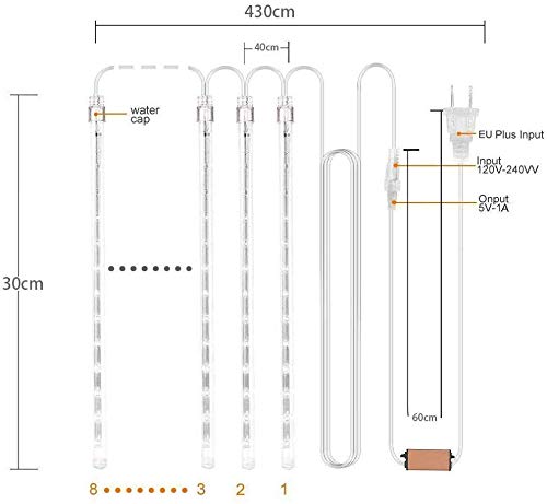 EEIEER Meteorschauerlichter, Beauty Your Wonderful Life Meteor Shower Lights – die Lichter jeder Röhre schalten sich nach und nach ein und aus, und zwar schnell wie Meteorschauer oder fallender Regen am Nachthimmel, sehr schön. Sie kann als eine oder mehrere bis zu 5 Lichterketten verwendet werden . Fallende Regenlichter – Auch als Eiszapfenlichter. Es ist auch für Hausgarten Zaun Dekor, Geburtstagsfeier, Valentinstag, Geschäftsfeier, Weihnachten, Neujahr, Hochzeit, Party, Einkaufszentren und Hotels geeignet. Spezifikationen: ★ LED-Typ: 2835,192LEDs bieten 360-Grad-Leuchtwinkel, wodurch die fallenden Regenlichter heller und schöner werden. Geringer Stromverbrauch und Energieeinsparung. ★ LED-Birnen pro Röhre: 24 Birnen Menge: 8 Röhren ★ Gesamtzahl der LED-Lampen: 8 Röhren x 24LED (192LEDs) ★ Wasserdicht: Die LED-Röhre ist IP65 Wasserdicht, transparentes PC-Material, korrosionsbeständig, kostenbeständig, alterungsbeständig, haltbarer, frei von Zeit- und Raumeinschränkungen. ★ Schlauchlänge: 30 cm Kabellänge: 2.5M Eingang Spannung: 110V-220V Watt: 5W Bemerkt: 1.Bitte beachten Sie, dass der Stecker NICHT wasserdicht ist. Halten Sie ihn daher vom Wasser fern. 2.Bitte stellen Sie sicher, dass die Stecker / Buchsen korrekt angeschlossen sind. Wenn Sie das Licht nicht einschalten können, wird es durch die falsche Verbindung der Anschlüsse verursacht. Trennen Sie sie bitte und ändern Sie eine andere Richtung, um sie erneut anzuschließen.