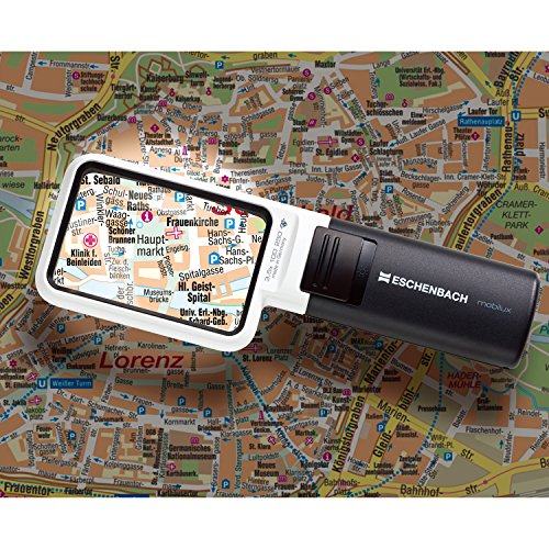 Kennen Sie das? Sie suchen zuhause im Telefonbuch vergeblich eine Nummer, Sie wollen im Supermarkt klein geschriebene Preise erkennen – ob zuhause oder unterwegs – das Mobilux-Lupenglas wird Ihr zufälliger Begleiter beim Lesen von Kleingedrucktem! Diese neue, attraktive LED-Leuchtlupe, jetzt mit modernster SMD-LED- und cera-tec-Technologie aus der ESCHENBACH-Mobilux-Serie bietet auch bei zunehmendem Alter und schwächerer Augenleistung eine große Unterstützung beim Lesen! Denn zum entspannten Lesen ist fast nichts so wichtig, wie das richtige Licht und eine entsprechende Vergrößerung mit klarer Abbildung. Zudem ermöglicht dieses hochwertige Lupenglas eine einfache Handhabung, dank großer Lichtschalter. Als einzige LED-Leuchtlupe mit cera-tech Hartbeschichtung ist die Mobilux-Serie mit Step-upconverter für gleichmäßige Leuchtkraft über einen langen Zeitraum ausgerüstet. Dies ermöglicht auch den Einsatz von wieder aufladbaren Akkus. Die hochwertige Linse mit 3-facher Vergrößerung wird vor Verkratzen dank der einzigartigen Eschenbach-cera-tec-Hartbeschichtung bewahrt. Die entsprechende Abbildungsqualität wird durch die Fertigung und Entwicklung made in Germany gewährleistet. Perfektioniert wird die neue Mobilux-Serie durch das neue Design und das Zubehör. Denn, die neue, ausgeprägt runde Griffform ist der Ergonomie der menschlichen Hand angepasst.Außerdem sind zwei unterschiedliche Lichtfarben über den beiliegenden Filter wählbar. Produkteigenschaften: – Einfacher Batteriewechsel – 2 verschiedenen Lichtfarben – ohne Lampenwechsel – LED-Beleuchtung besitzt eine Lebensdauer von ca. 50.000 Stunden – Spannungssteuerung über Step-Up-Konverter = hellere, konstant bleibende Ausleuchtung – bis zu 1.500 Lux Helligkeit – Definierte Einstellentfernung: 400