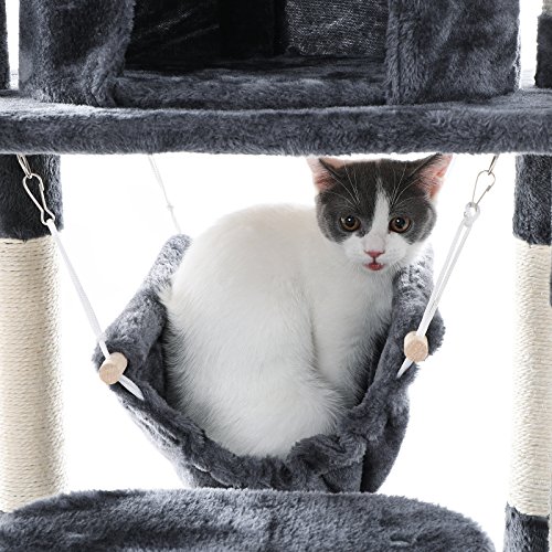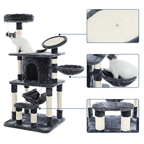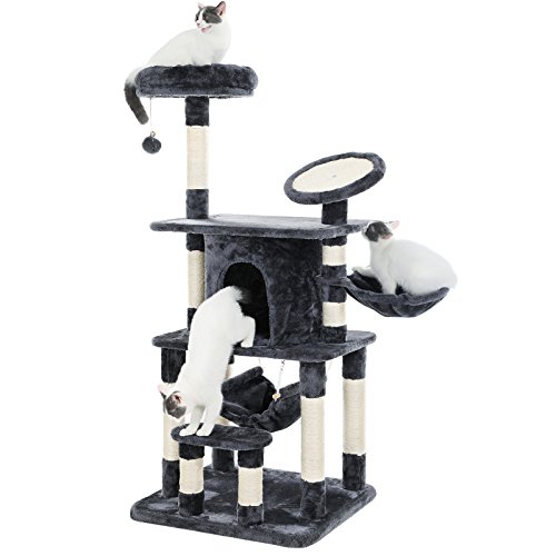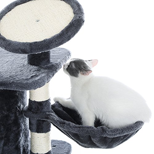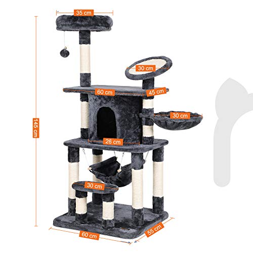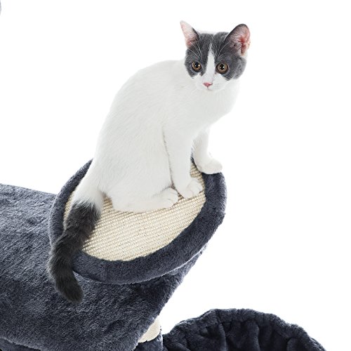 Die Erfinder unserer neuen Marke „FEANDREA“ haben einen ganz besonderen Bezug zu Katzen: durch zwei kleine, verwaiste Kätzchen, die von einem Mitarbeiter des Unternehmens liebevoll aufgepäppelt wurden, entstand die Idee, tiergerechte Möbel zu entwickeln. Mit dieser herzerwärmenden Geschichte im Hinterkopf kreierten die Designer von „FEANDREA“ gemütliche, funktionale und stylishe Haustiermöbel wie den oben gezeigten Kratzbaum. Kletterbaum mit zahlreichen BesonderheitenUm den besonderen Anforderungen aller Katzen gerecht zu werden, weist unser Katzenbaum einige Besonderheiten auf. Zunächst wurde die Stabilität verbessert. Hierzu wurde die Bodenplatte mit zusätzlichen Holzleisten verstärkt und auch die Sisalstangen mit einem Durchmesser von 7,1 cm und der Kippschutz sorgen für eine hohe Standfestigkeit. Produktdetails:- Farbe: Rauchgrau- Material: hochwertige Holzspanplatte, Plüsch, Sisal, verstärkte Hartpapperolle- Maße: 90 x 145 x 55 (B x H x T)- Gewicht: 16,4 kg Lieferumfang:- 1 x Kratzbaum- 1 x Anleitung (DE, EN, FR, IT, ES) FEANDREA Hinweise:- Stellen Sie den Kratzbaum in eine Zimmerecke und nutzen Sie einen ebenen Untergrund.- Verwenden Sie den Kratzbaum nicht in einer feuchten Umgebung – Kinder dürfen nicht auf den Kratzbaum klettern oder mit ihm spielen.- Wir empfehlen Ihnen, dieses Produkt mit den mitgelieferten Kippsicherungen an der Wand zu befestigen.- Sollte Ihr Katze damit beginnen, auf dem Plüschball zu kauen oder möchte sie diesen sowie das Gummiband fressen, so entfernen Sie das Spielzeug bitte und bewahren Sie es außerhalb der Reichweite Ihrer Katze auf.