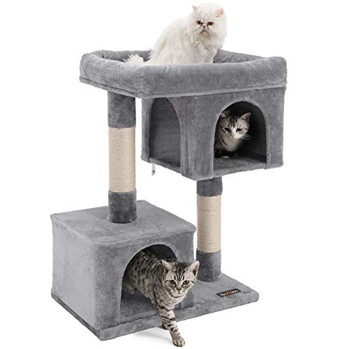 FEANDREA Katzenbäume haben alle die Eigenschaften, die Sie brauchen, um Ihre Katzen zum Aufblühen zu bringen.ENTSPANNEN – Vergrößerte obere Fläche mit erhöhtem Rand bietet ein luxuriöses Lounge-Erlebnis.KRATZEN – Starke Stangen, die mit natürlichem Sisalseilen bedeckt sind, ermöglichen es Katzen, ihre Krallen zu kratzen und sich zu dehnen.SCHLÄFCHEN HALTEN – Dank der zwei Höhlen können Ihr Katzen endlich in ihr eigenes Bett und verhalten sich friedlich.Abgesehen von all dem Spaß, wird die Sicherheit Ihrer Haustiere gewährleistet. Der Boden ist mit Leisten verstärkt, um die Stabilität zu gewährleisten; Anti-Kipp-Beschläge sind ebenfalls im Lieferumfang enthalten, sodass Sie den Kratzbaum an der Wand befestigen können.Egal, ob Sie Kätzchen, große Katzen oder ältere Katzen haben, dieser Katzenbaum ist ein wunderbares Zuhause für ihre pelzigen Freunde. Produktdetails:- Farbe: hellgrau- Material: CARB-zertifizierte Spannplatte, Plüsch, Sisal – Produktmaße: 74 x 40 x 84 cm (B x T x H)- Gewicht: 10,9 kg Lieferumfang:- 1 x Kratzbaum- 1 x Anleitung (DE, EN, FR, ES, IT) FEANDREA Hinweise:- Stellen Sie den Kratzbaum auf eine ebene Fläche in eine Zimmerecke.- Vermeiden Sie eine feuchte Umgebung.- Kinder dürfen nicht auf den Kratzbaum klettern oder mit ihm spielen.- Wir empfehlen Ihnen, diesen Turm mit den mitgelieferten Kippsicherungen an der Wand zu befestigen.