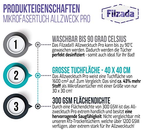 Textilkennzeichnung: 80 % Polyester 20% Polyamid Hinweis: Es handelt sich hierbei um professionelle Microfasertücher – bitte waschen Sie das Tuch vor dem ersten Gebrauch! Für extrem hochwertige Untergründe empfehlen wir Ihnen dringend unser kantenloses Mikrofaserpoliertuch! Filzada® Mikrofasertücher – von Profis für Profis!Für alle die es gerne hochwertig mögen. Absolute Premium Allzwecktücher mit 300 GSM – 100% auch für professionelle Anwender geeignet. Überzeugen Sie sich selbst von der Qualität! Wir haben unser Modell mit einer Größe von 40 x 40 cm bewusst etwas größer gestaltet und garantieren Ihnen dadurch noch mehr Aufnahmefähigkeit und Komfort bei der Pflege. Warum das Filzada® Reinigungstuch?- Sie stehen auf Qualität und haben keine Lust auf Fransen, Fussel oder aufgerissene Nähte direkt nach der ersten Wäsche?- Sie suchen Reinigungstücher in absoluter Premiumqualität?- Sie sind auf der Suche nach noch mehr Komfort bei der Pflege Ihrer Untergründe?- Sie wollen das ideale Preis-/ Leistungsverhältnis? Dann sind Sie mit diesem Set hier bestens ausgestattet. Wir bieten Ihnen diverse Setgrößen in unterschiedlichen Farben. Fügen Sie die Filzada® Allzwecktücher jetzt dem Einkaufswagen oben hinzu und pflegen Sie Ihre Untergründe noch effizienter!