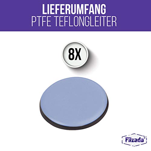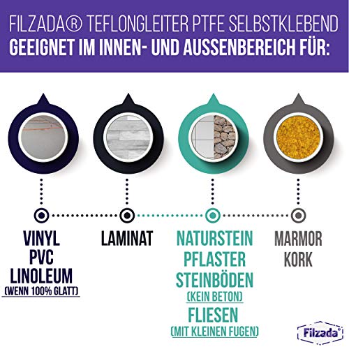 PTFE Möbegleiter Selbstklebend von Filzada® WISSEN: Bei Gegenständen welche extrem häufig oder auf fugenreichen Untergründen/ Böden bewegt werden, sind Filzgleiter mit Schraube oder Nagel die bessere Wahl! ACHTUNG: PTFE Gleiter sind für fast alle Böden geeignet. Der Vorteil gegenüber Filzgleitern ist, dass diese unempfindlich gegen Nässe sind. (Auch für den Außenbereich geeignet!) Für folgende Böden sind PTFE Gleiter NICHT geeignet: Empfindliche Holzböden Elastische Böden mit rauer Oberfläche (manche Linoleumarten) Betonboden Estrich Bei diesen Bodenarten entsteht durch die Reibung eine zu hohe Wärmeentwicklung, dadurch haben die Gleiter nur eine extrem kurze Lebenszeit und erzeugen Streifen, Kratzer. PRODUKTEIGENSCHAFTEN & LIEFERUMFANG 8x Telfongleiter selbstkebend (rund) – Ø 40 mm ANWENDUNGSBEREICH Die Teflongleiter von Filzada® sind geeignet für: Laminat, Fliesen, Marmor, Vinyl, PVC, Kork, Naturstein, Teppich / Teppichböden, raue Fliese, Steinboden, Pflaster Einsetzbar als: Stuhlgleiter, Möbelgleiter, Bodengleiter, Parkettgleiter Bodenschoner, Sesselgleiter, Stuhlbeingleiter uvm.. MONTAGE Klebefläche reinigen und entfetten Klebefolie entfernen Filzgleiter anbringen und einige Sekunden nachdrücken Objekt 24 Stunden Belasten Mit diesen Filzgleitern sind Sie bestens ausgestattet – bestellen Sie jetzt Ihre PTFE Gleiter von Filzada®