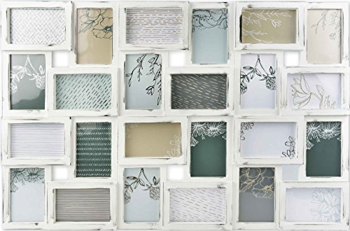 Die trendige Collage von gallery solutions bietet Ihnen die Möglichkeit 24 Fotos oder Karten im Format 10×15 cm aufzuhängen (Hinweis: Die Profile decken rundum 0,5 cm des Motivs ab, somit sind nur 9×14 cm sichtbar.). Natürlich können Sie auch gerne die mitgelieferten Usable Art-Einleger verwenden. Diese greifen den floralen Trend auf und harmonieren ideal mit dem rustikalen Profilfarbe Antik Weiß.Die Profile sind etwa 16 mm breit und 11, bzw. 19 mm hoch. Dadurch ensteht eine hervorragende Tiefenwirkung, welche die Motive hervorragend in Szene setzt. Die Kunststoff-Collage ist aus einem Guss, sodass Sie keine Gehrungen sehen. Dank der PVC-Scheibe wird Glasbruch und ein hohes Gewicht vermieden. Die schwarze Papprückwand ist durch 24 Dreh-Pins befestigt. Dank der vier Aufhänger auf der Rückseite, können Sie die Wanddekoration horizontal und vertikal aufhängen.Nicht nur für Ihr eigenes Zuhause ist der Rahmen ein Eye-Catcher, sondern er ist auch ideal geeignet als Geschenk für Familie und Freunde.