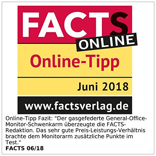 Bringen Sie Ihren Monitor in Position: federleicht und flexibel einstellbarAUSZEICHNUNGEN / BEWERTUNGEN / PRESSESTIMMEN:FACTS (06/18): Online-Tipp Fazit: „Der gasgefederte General-Office-Monitor-Schwenkarm überzeugte die FACTS-Redaktion. Das sehr gute Preis-Leistungs-Verhältnis brachte dem Monitorarm zusätzliche Punkte im Test.“. Richten Sie Ihren Monitor flexibel aus: Jetzt schwenken Sie den Bildschirm mit nur einer kleinen Handbewegung zu jeder Position im Raum! Zeigen Sie Ihren Kollegen schnell ein Dokument oder betrachten Sie Fotos und Videos mit Ihrer Familie. Starker Halt, einfache Anbringung: Den Schwenkarm montieren Sie in wenigen Augenblicken an Ihren Tisch. Kein Bohren nötig: Ihr Monitor mit VESA-Standard passt perfekt auf die Fixierung. Dank stabiler Verarbeitung hängt er jederzeit sicher und wackelfrei. Sorgen Sie für einen freien Arbeitsplatz: Der Schwenkarm ersetzt nicht nur einen sperrigen Standfuß, sondern lässt auch das lästige Kabelgewirr vom Tisch verschwinden! Mit der abnehmbaren Halterung führen Sie die Kabel elegant und unauffällig nach unten weg.Zubehör- & Mitbestell-Empfehlungen:Notebookhalter: B01AWCIWV4Der Statt-Preis von EUR 99,90 entspricht dem ehem. empf. VK des Lieferanten.