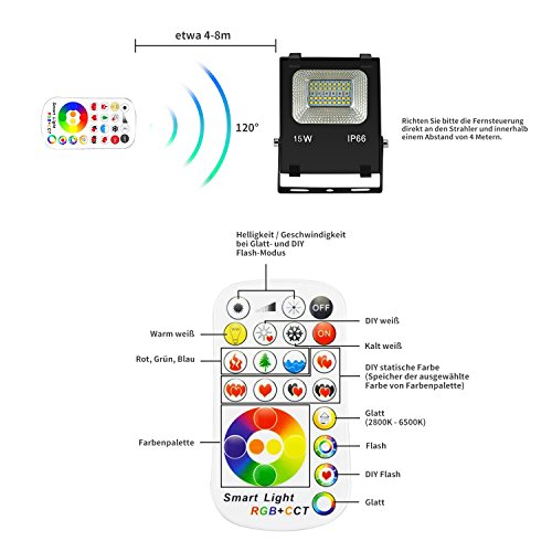 LED Fluter GIM 15W Scheinwerfer Außenstrahler Verbesserte Version mit Einstellbarer Farbtemperatur Die Farbtemperatur kann von 2800K bis zu 6500K eingestellt werden und die Lieblingsfarben können in Speichertasten gespeichert werden. Spezifikationen Farben & Modi: 120 statische Farben und 4 dynamlische Modi (FLASH/STROBE/FADE/SMOOTH) Steuerung: Fernbedienung Wasserschutz: IP66 Leistung: 15W Lichtwinkel: 120° Kabellänge: 1,5m Eingangsspanung: 90-240V Lumen: 1200LM Lieferumfang 1 x LED Fluter GIM 1 x Fernbedienung 1 x Anleitung