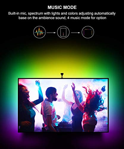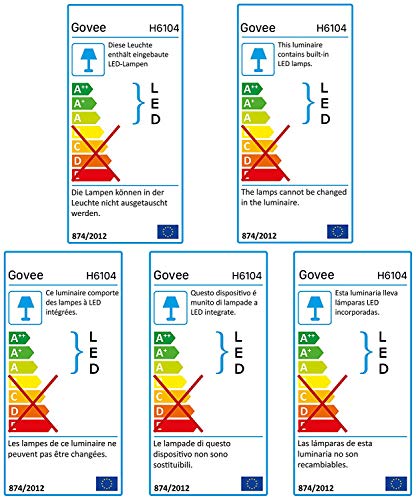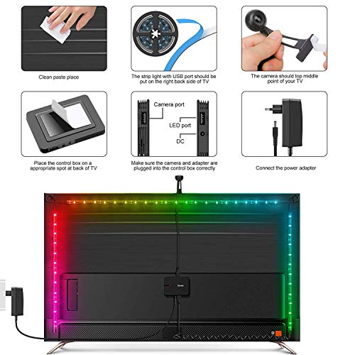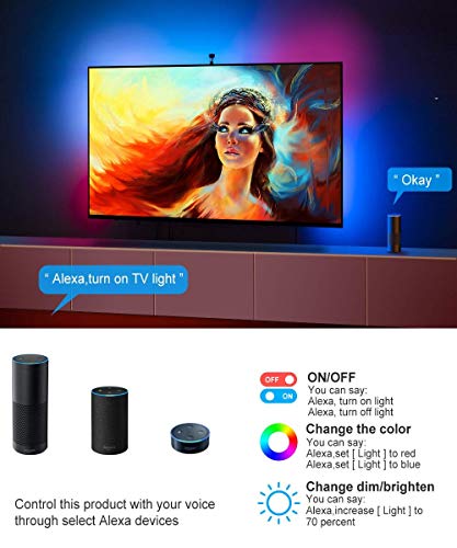 Govee Alexa WIFI TV Lichter, schafft IhrHeimkino Wie arbeiten die Beleuchtung mit Alexa : · Schritt 1: Schließen Sie die WLAN-Lichtleiste mit WLAN-Modusan. · Schritt 2: Eröffnen Sie ein Konto bei der APP „GoveeHome“. · Schritt 3: Fügen Sie Ihr Licht hinzu und ändern Sie denName. · Schritt 4: Aktivieren Sie die APP „Alexa“. · Schritt 5: Anmelden und Geräte ermitteln. Bitte beachten Sie: Bei dieser WLAN LED Hintergrundbeleuchtunghandelt es sich um die akualisierte Version, die über eine APP anstelle einerKalibrierungskarte kalibriert wird. Mit der TV-Hintergrundbeleuchtung wirdkeine Kalibrierungskarte geliefert!!! Eine romatische Atmosphäre schaffenErweitert die Schönheit und Eleganz von Farben in Ihrem Raum. Die Magie vonFarben erstrahlt direkt aus der Beleuchtung Ihres Hauses per Kamera und schaffteine romantische Atmosphäre. Bauen Sie Ihr eigens Heimkino. Augenbelastung reduzierenDie Neigungsbeleuchtung erhöht die Bildschärfe, erhöht den Kontrast undbewahrt die korrekte Farbwahrnehmung des Videobildes. Eine bequemeNeigungsbeleuchtung reduziert die Ermüdung der Augen zwischen dem hellenFernseher und dem dunklen Raum. Musikmodus Mit dem Musikmodus wird Ihr Raum zu einem Teil Ihrer wundervollen Welt mitkräftigen und strahlenden Farben, die perfekt auf alle Aktionen auf dem Bildschirmabgestimmt sind. Erreicht eine fantastischere Musikshow. Genießen Sie bitteIhre eigene schöne Zeit. Diese WLAN intelligente TV Hintergrundbeleuchtung ist die akualisierte Version.Kalibrieren Sie bitte mit der App „Gove Home“. Keine Kalibrierungskarte wird mit dem TV Hintergrundbeleuchtungs-Kit geliefert.