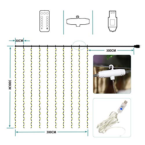 Eigenschaften:1.Unsere Vorhanglichter ist mit einem 3M / 9.84ft langen führenden Draht, 3M / 9.84ft x 3M / 9.84ft nach ungefaltet und 300 LED-Birnen in 10 Schnüren. Jede Saite ist in einem Abstand von etwa 0,3 m voneinander angeordnet. Jedes Set besteht aus einer drahtlosen IR-Fernbedienung, einem Controller.2.Die Lichter ist speziell für verschiedene Arten von Anlässen wie Dekoration von Festivals, Partys, Hochzeiten, Terrassen, Restaurants, Hotels, Clubs, Einkaufszentren, Konzerte, Modeschauen und so weiter. Sie bieten Ihnen einen warmen und einladenden Glanz, helfen, eine nette Atmosphäre Atmosphäre zu schaffen.3.Die drahtlose Fernbedienung ist mit IR-Technologie, hat es die Merkmale der langen Steuerdistanz Bereich bis zu 10M / 32.8ft, geringer Stromverbrauch, Fernübertragung und starke Anti-Interferenz-Fähigkeit, etc. Die Fernbedienung sieht modisch und elegant aus, mit einfachen und praktischen Funktionen von 8 verschiedenen Blitzmodi ändern und Helligkeitsdimmen und Timer, ist es sehr einfach und bequem zu bedienen.4.Steuerungsbox bietet Ihnen eine zusätzliche Möglichkeit, Flash-Modelle zu ändern, falls die Fernbedienung nicht bei Ihnen ist. Warnungen und wichtige Tipps: 1. Dieses Produkt ist kein Spielzeug. Bitte halten Sie sich von Kindern unter 3 Jahren fern.2. Dieses Produkt enthält Kleinteile, die beim Abnehmen zu Erstickungsgefahr führen können.3. Bitte erlauben Sie Kindern NICHT, mit dem Ankerspieß zu spielen, da der Endpunkt des Ankerspikes scharf ist.4. Hängen Sie niemals Ihre Lichter auf, wenn sie eingesteckt sind.5. Von Feuer und offenen Flammen fernhalten.6. Wenn nach dem Erhalt des Pakets ein Geruch auftritt, liegt das an dem Material. Bitte nehmen Sie das Fadenlicht aus der Verpackung und lassen Sie es für eine Weile an der Luft, der Geruch verschwindet natürlich.Packliste:1x Greatever Vorhang Lichter1x Fernbedienung1x Benutzerhandbuc