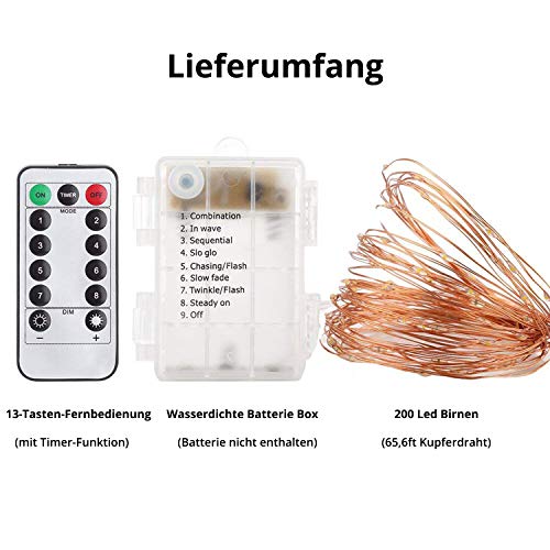 Technische Parameter Material: ABS + Kupferdraht Leitungslänge: Draht 0,5 m, Kupferdraht 20 m, Gesamtlänge 20,5 m Wasserdichte Leistung: Kupferdraht IP65, Batteriekasten IP44 Spannung: 4,5 V (drei AA-Batterien, und Batterien sind nicht enthalten) Nutzungsdauer: 48 Stunden, das Licht wird von hell nach dunkel gedimmt Lebensdauer: 50.000 Stunden Ist es zu weit von der Steckdose entfernt oder gibt es keine Steckdose? Machen Sie sich keine Sorgen, das Batteriegehäuse, das von der Lichterkette getragen wird, löst alle Ihre Sorgen, selbst wenn es an einer hohen Stelle dekoriert ist. Fernbedienung Anweisungen ON/OFF: Ein- und Ausschalten der Stromversorgung TIMER: Timing-Taste 1-8 Zifferntasten: Ersetzen Sie den Beleuchtungsmodus + / -: Verbessert / reduziert die Helligkeit der Saite (Die Fernbedienung wird mit einer Batterie geliefert) Batteriekasten Anweisungen 1, Legen Sie drei AA-Batterien ein 2, Die Taste am Batteriekasten kann auch zur Steuerung der Lichterkette und zur Beleuchtung verwendet werden Hinweis Bitte verwenden Sie nicht zu viel Kraft oder wiederholtes Biegen an der gleichen Stelle des Kupferdrahtes, um zu vermeiden, dass der Kupferdraht bricht. Bitte richten Sie den Batteriekasten bei Verwendung der Fernbedienung aus, die Reichweite der Fernbedienung beträgt 10 Meter. Der Batteriekasten ist IP44 und der Kupferdraht kann in Wasser eingetaucht werden. Wenn es im Freien verwendet wird, machen Sie bitte wasserdichte Maßnahmen für die Batteriekasten. Paket enthält 1 × Kupferdraht lichterkette 1 × Fernbedienung 1 × Bedienungsanleitung Wenn es ein Problem mit dem Produkt gibt, kontaktieren Sie uns bitte und wir werden es so schnell wie möglich für Sie lösen.