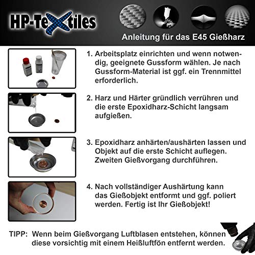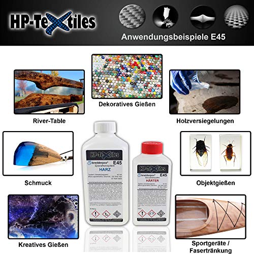 Epoxidharz-System E45 – Mehrzwecksystem, dünnflüssig, farblos transparent (wasserklar) Das Epoxi-System E45 ist eine ungefüllte, niedrigviskose 2-Komponenten Kombination von Harz und Härter mit einer Verarbeitungszeit von ca. 45 min. Einsetzbar für Gießanwendungen mittlerer Schichtstärken (bis ca.15 mm / abhängig von mehreren Faktoren). Für Gießanwendungen mit höherer Schichtdicke empfehlen wir mehrere Schichtvorgänge durchzuführen. Wenn Sie z. B. eine Schichtdicke von ca. 4 cm erreichen wollen, empfehlen wir vier Gießvorgänge á 10 mm. Zwischen den Gießvorgängen 1 – 2 Stunden vergehen lassen, sodass die vorherige Schicht angehärtet ist. Eigenschaften und Einsatzgebiete: Transparenter, schwundarmer Verguss mit klebfreier Oberfläche Sehr gute Fließeigenschaften (niedrigviskos) Kalthärtend, bei Raumtemperatur entformbar Hochfüllbares System Ergibt druckfeste und schlagzähe Formen/Formteile Einbettungsharz für Verguss (dekorative Elemente) Holzporenfüller Laminierharzsystem zur Verwendung in Kombination mit Verstärkungsfasern Epoxidharz aus eigener Formulierung, made in Germany E45 ist frei von Nonylphenol! Während der Aushärtung wird Energie abgegeben, daher zur Vermeidung von Hitzestaus für ausreichende Wärmeabführung sorgen. Mengen der Einzelansätze auf den jeweiligen Arbeitsschritt abstimmen. Verarbeitungsdaten: Farbgebung: farblos (Harz) / farblos (Härter)Mischungsverhältnis (Gewicht): 100 Teile Harz / 50 Teile HärterMischungsverhältnis (Volumen): 100 Teile Harz / 57 Teile HärterMischungsviskosität: niedrigviskosTopfzeit (Verarbeitungszeit): ca. 45 min (100 g bei 20 °C)Belastbar: 48 h (bei 20 °C)Verarbeitungstemperatur (optimal): 18 – 25 °C Technische Datenblätter auf Anfrage