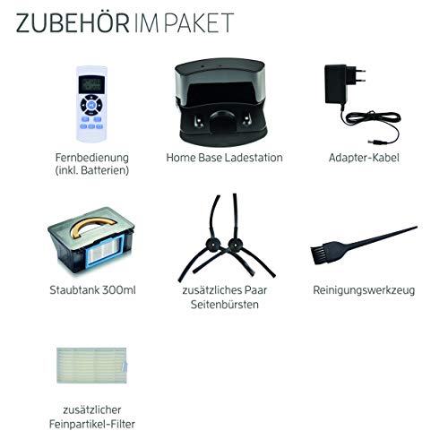 -Staubsauger-Roboter mit optimierter Adaptive Navigation 2.0-Lithium-Ionen-Akku mit 2h Laufzeit-Staubbehälter-Volumen: 0,3 l; Feinpartikel-Filter -Schallleistungspegel: 68 dB(A) -Inkl. Fernbedienung, Ladestation