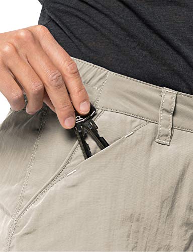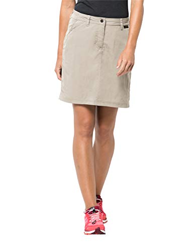 Südspanien, blauer Himmel, Sommerhitze – auf deinen Reisen in besonders warme Gegenden ist der KALAHARI SKORT ganz besonders angenehm zu tragen. Er ist Rock und Shorts in einem und liegt luftig leicht am Bein. Das SUPPLEX-Nylongewebe bietet hervorragenden UV-Schutz – besonders praktisch, wenn du den ganzen Tag mit wenig Schatten unterwegs bist. Abends wäschst du den Rock einfach kurz durch – er trocknet nämlich so schnell, dass er am nächsten Morgen wieder einsatzbereit ist. In der Geheimtasche, die wir auf der Innenseite integriert haben, verstaust du ein paar Geldscheine oder die Kreditkarte.SupplexEin angenehm zu tragendes Funktionsgewebe aus Nylongarnen für Bekleidung. Es bietet einen weichen, textilen Griff, ist pflegeleicht und knitterarm und dennoch strapazierfähig. Zudem besitzt es einen hohen UV-Schutz. Die Funktion ist in der Faser selbst verankert und wird nicht durch eine zusätzliche Ausrüstung bewirkt. Der Schutz ist dauerhaft und kann nicht durch Schwitzen oder Kontakt mit Wasser aufgehoben werden.Q.M.C.Quik Moisture Control (QMC) bezeichnet eine Technologie, bei der die Fasern Feuchtigkeit besonders schnell aufnehmen und weitergeben können. Durch die spezielle Verarbeitung der Fasern entsteht eine vergrößerte Oberflächenstruktur, wodurch Feuchtigkeit besser aufgesaugt und auf dieser Fläche verteilt werden kann. Dadurch trocknet der Stoff äußerst schnell und es entsteht eine optimale Feuchtigkeitsregulierung.UV ShieldViele von Jack Wolfskins Oberteilen und Hosen haben die Kennzeichnung UV Shield. Bei diesen Produkten ist der Stoff besonders eng gewebt, sodass UVA- und UVB-Strahlung nicht durchdringen kann. Das bedeutet, sie bieten unterwegs einen dauerhaften Sonnenschutz nach australischem Standard (AS/NZS4399: 1996). Denn gerade in Regionen mit hoher UV-Strahlung,…