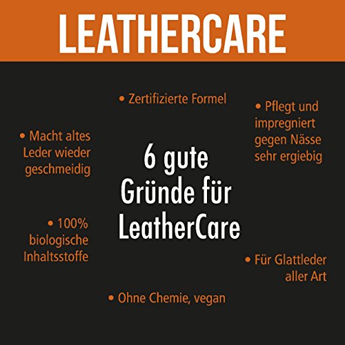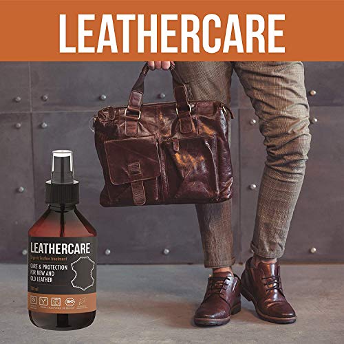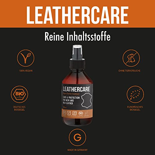 LeatherCare: Bio Lederpflegespray für Glattleder aller Art, mit Jojobaöl – halten sie ihr Leder sauber und strahlend Durch die raffinierte Kombination von feinsten Pflanzenölen aus biologischem Anbau, pflegt LeatherCare Ihre Lederwaren langanhaltend und schonend. Kokosöl und Diestelöl schützen das Leder vor dem Austrocknen und imprägnieren es gegen Wasserflecken. Jojobaöl mit seinem natürlichen Lichtschutzfaktor schützt die feinen Öle und das Leder vor Schäden durch UV- Strahlung und ergänzt die Lederpflege um einen Langzeiteffekt zu gewährleisten. Unser Spray ist nicht nur für Autos oder Leder Möbel, sie können das Spray auch für Kleidung wie eine Lederjacke oder Lederschule verwenden. Es pflegt das Leder ohne es zu Verunreinigen oder zu beschädigen. Anwendung: Durch die praktische Sprayvorrichtung lässt sich LeatherCare präzise und fein auf Lederwaren auftragen und leicht mit einem Tuch verteilt werden. Nach einigen Stunden Einwirkzeit wird Ihr Leder in neuem Glanz erstrahlen – egal ob auf Möbeln, im Auto, Kleidung oder Reitzeug.