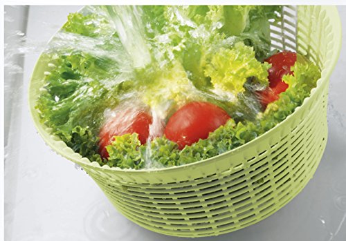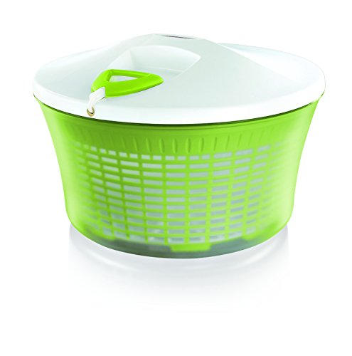 Die Salatschleuder aus Kunststoff ist spülmaschinenfest mit einem Fassungsvermögen von 5,5 Litern.