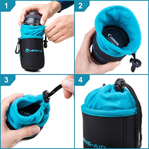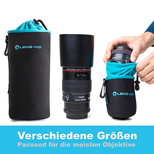 Pfleglich behandelt, liefern Objektive über einen langen Zeitraum perfekte Bilder. Zur Objektivpflege gehört nicht nur die regelmäßige Reinigung sondern auch die sachgerechte Lagerung. Gerade auf Reisen oder wenn es beim Fotografieren mal hektisch zugeht, wird dies schnell zur Nebensache. Mit den Lens-Aid Objektivbeutel sichern und transportieren Sie Ihre wertvollen Kamera-Objektive nicht nur optimal, sondern haben sie dank Kordelverschluss auch schnell griffbereit und wieder verstaut! Details: Dickes Neopren für optimalen Schutz vor StößenWeiche Fleece-Fütterung für extra Schutz vor KratzernKordel-Schnellverschluss für einfaches Öffnen und SchließenGürtelschlaufe und Karabiner zum Tragen und Befestigen Hinweis: Lieferung ohne abgebildetes Objektiv & sonstiges Zubehör. Innen-Maße (Maximale Objektiv-Abmessungen): XXS: 7 cm x 5,5 cm Durchmesser XS: 8 cm x 7 cm Durchmesser S: 10 cm x 8 cm Durchmesser M: 14 cm x 9 cm Durchmesser L: 18 cm x 10 cm Durchmesser XL: 25 cm x 10 cm Durchmesser Lieferumfang:: 1x XS, 1x S, 1x M, 1x L, 1x XL