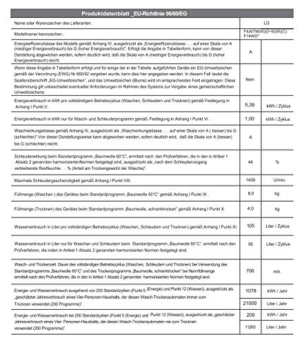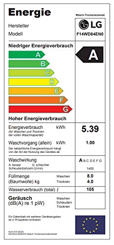 Inverter Direct Drive™ – Super leise & langlebig: LG F14WD 84EN0DirectDrive heißt Direktantrieb. Und das bedeutet: mehr Energieeffizienz, mehr Laufruhe und mehr intelligente Trommelbewegung für noch schonendere Waschgänge. Und eine erhöhte Lebensdauer, den ein Direktmotor enthält weniger verschleißfähige Teile.6 Motion DirectDrive™ Sechs unterschiedliche Trommelbewegungen, die auf das Waschprogramm und den speziellen Ablauf abgestimmt sind – wie z.B. Rollen und Schwingen.NFC – Waschprgramm – Download Sie erwarten Familienzuwachs oder Treiben viel Sport? Dann passen Sie Ihre Waschprogramme dem individuellen Bedarf an. Per Smartphone können zusätzliche Waschprgramme per NFC auf die Waschmaschine geladen werden.Smart Diagnosis™ Bei einer Störung kann mittels einer Tastenkombination eine Tonfolge ausgelöst werden, anhand derer der Servicemitarbeiter das Problem via Telefon identifizieren kann. Einfache Probleme können sofort behoben werden, so dass überflüssige Kundendienstbesuche eintfallen.Features:-Inverter Direct Drive™ (Super leise & langlebig)-6 unterschiedliche Trommelbewegungen-Tag On NFC Funktion (Download Waschprogramme / Smart Diagnosis – Fehlerdiagnose)-14 vorprogrammierte Programme-Digitales Touchdisplay mit Restanzeige und StartzeitvorwahlTechnische Daten Produkt-Features Waschvollautomaten -Feature1: energieeffizienz-a -Feature2: waschwirkung-a -Feature3: schleuderwirkung-a -Feature4: beladung-8kg Typ -Typ: Waschtrockner Ausstattung Gerät -Energieeffizienzklasse: A -Energieeffizienzpfeil: A -Farbwert: u-EnergyLabel-efficiencyClass–1 -Max. Füllmenge Waschen (kg): 8 -Max. Füllmenge Trocknen (kg): 4 -Waschwirkungsklasse: A -Max. Schleuderdrehzahl bei Standardprogramm Baumwolle 60°C“: 1400 -Max.