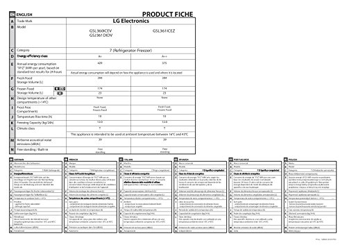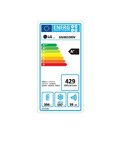 Total No Frost: Nie wieder abtauen Moist Balance Crisper: Obst & Gemüse bleibt länger frisch Door-in-DoorTM: ideal für Snacks & Getränke Eiswürfel-, Crushed Ice- und Wasserspender Gerätemaß: 179 x 91,2 x 71,7 cm (H x B x T) Informationen zu Energieeffizienz und Verbrauchswerten Hersteller: LG Electronics Modell:GSJ361DIDV a. Kühlen / Gefrieren: Energieeffizienzklasse: A+ auf einer Skala von A+++ (höchste Effizienz) bis D (geringste Effizienz)Kühlen: Energieeffizienzklasse SBS: keine Angabe auf einer Skala von A+++ (höchste Effizienz) bis G (geringste Effizienz)Gefrieren: Energieeffizienzklasse SBS: keine Angabe auf einer Skala von A+++ (höchste Effizienz) bis D (geringste Effizienz) b. Kühlen / Gefrieren: jährl. Energieverbrauch (Aec): 429,00 kWh/JahrKühlen: jährl. Energieverbrauch (Aec): keine AngabeGefrieren: jährl. Energieverbrauch (Aec): keine Angabe c. Nutzinhalt gesamt in l: 591 LiterNutzinhalt Kühlteil in l: 394 LiterNutzinhalt Gefrierteil in l: 197 LiterSternekennzeichnung Gefrierteil: 4 SterneSeparates Fach mit anderer Temperatur: keine Angabe d. Klimaklasse: T e. Kühlen / Gefrieren: Luftschallemissionen (dB): 39,00 dB(A) re 1 pWKühlteil: Luftschallemissionen (dB): keine AngabeGefrierteil: Luftschallemissionen (dB): keine Angabe f. Kühlen / Gefrieren: Einbaugerät: neinKühlteil: Einbaugerät: keine AngabeGefrierteil: Einbaugerät: keine Angabe