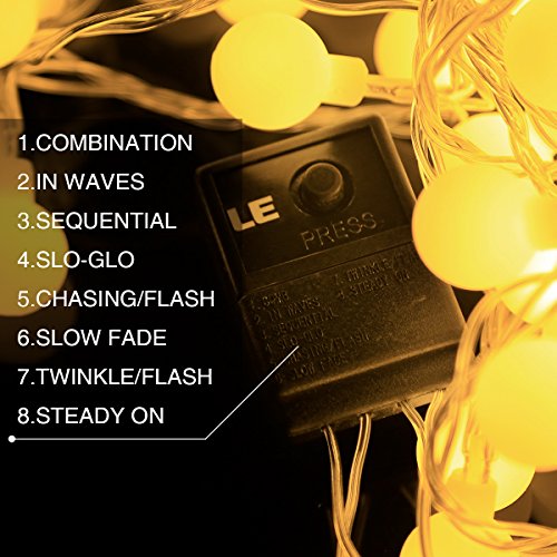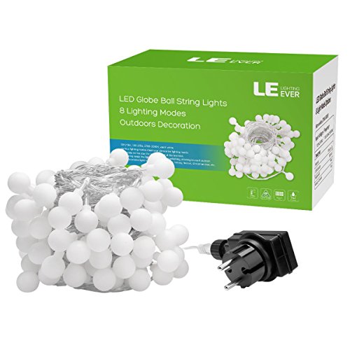 Lichterkette Die Lichterkette ist insgesamt 13 Meter lang. Auf 10 Metern Länge befinden sich 100 farbige LEDs, gefolgt von dem Steuerungsgerät und weiteren 3 Metern Stromkabel plus Netzteil. Die Lichterkette kann nicht gekürzt werden. Farbenspiel Es stehen acht verschiedene Lichtmodi per Knopfdruck zur Verfügung. Energiesparend Mit einem Gesamtverbrauch von nur 2,2 Watt ist der Stromverbrauch sehr gering. Netzstrombetrieben Das Netzteil hat die GS- sowie CE-Zertifizierung und lässt sich mit unterschiedlichen Spannungen von 100 bis 240 Volt betreiben. Mit nur 31 Volt besteht bei einem normalen Gebrauch kein Stromschlagrisiko. Wassergeschützt Spritzwassergeschützt gemäß IP44. Umweltfreundlich Kein Blei oder Quecksilber, keine UV- oder IR-Strahlung. Über LE Lighting EVER, abgekürzt LE, konzentriert sich auf hochwertige LED-Beleuchtung.Nur Highend-LEDS und fortschrittliches optisches Design werden von uns vertrieben. Genießen Sie Beleuchtung mit LE.