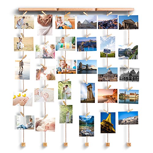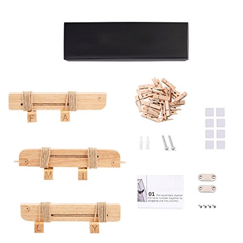 Love-KANKEI Hängende Bilderrahmen Collage drückt durch Ihr kreatives Design den Sinn von „FAMILY“ aus Super einfacher Zusammenbau Mit der zusätzlichen Wandhardware können Sie diesen Fotorahmen schnell zusammenbauen und an Wand befestigen. Dank 30 Klammer können Sie auch viele Fotos, Bilder, Kinder-Kunstwerke hängen und zeigen Wunderbares Geschenk Das Einzigartige Desgin von diesem Holzbilderrahmen lässt es möglich sein, Geschenk für Hochzeit, Geburtstag zu werden. Spezifikation Größe: 26 x 29 x 1.6 Inch Material: Holz + Hanfseil Gewicht: 454g Paketsinfo Bestandteil Holz * 3 Hanfseil * 3 Schraube* 2 Anschlussplättchen* 2 Holzklammern* 30 Doppelseitige Klebeband* 8