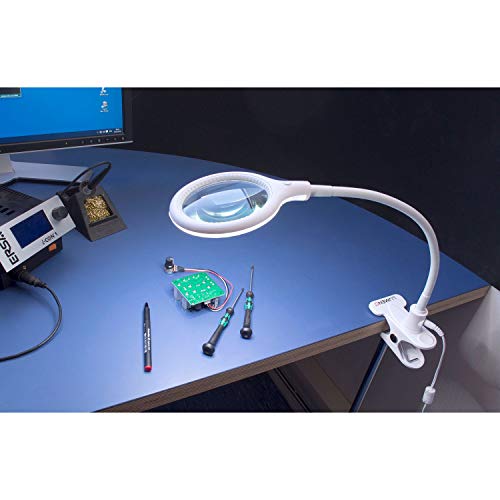 Lumeno 6803 LED Lupenleuchte mit 30 SMD-LEDs, Klemme, Tischfuß und SchwanenhalsMit 30 hochwertigen SMD-LEDs, einem Stromverbrauch von 6 Watt, einer Helligkeit von 300 Lumen und einer Lichtfarbe von 6400 K (Kelvin) bleibt bei der Klemmleuchte von Lumeno kein Wunsch offen. Die Verarbeitung des Schwanenhals wurde hierbei aus hochwertigem Metall vorgenommen und das Lampengehäuse aus Kunststoff. Befestigt wird die Lupenleuchte mit einer Tischklemme oder dem mitgelieferten Tischfuß. Die Tischplatte kann hierbei bis zu 5cm dick sein. Durch den Schwanenhals kann die Lumeno 6803 individuell ausgerichtet werden.Die Echtglaslupe mit 100 mm Linsendurchmesser und einer Vergößerung von 3 Dioptrien verspricht ein klares und sauberes Sichtfeld.