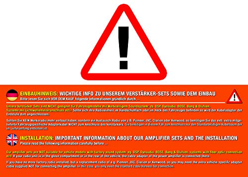 Dieser Verstärker wird zwischen Ihrem verbautem Radio (Original Werksradio oder z.B. Austausch von JVC,Kenwood etc.) und dem Original Kabelbaum Ihres Fahrzeuges angeschlossen. Somit entfallen Arbeiten wie z.B. Masse- oder Stromkabel im Fahrzeug zu verlegen. Die Stromversorgung des Verstärkers wird alleine über den mitgelieferten Kabeladapter / Kabelbaum gewährleistet. Durch die kompakte Bauweise des Verstärkers ist die Platzierung z.B. im Handschuhfach oder Armaturenbrett / Verkleidung möglich.NUR PASSEND FÜR NACHFOLGEND GENNANTE MODELLE!Modelle, Baujahr – EinbauinfoCascada ab 2013Ampera ab 2011 Insignia – 2008-06/2013 *Astra K ab 2015 (Nur für Modelle mit einem Anschluss-Stecker!*)Astra J – 2009-2015 *Meriva B ab 2010 Adam ab 2013 *Mokka ab 2012 *Zafira C / C-Tourer ab 2011 Corsa E ab 2014 (Nur für Modelle mit Standard CD Radio (nicht Intellilink Radio oder Navigation))* WICHTIGE INFO: Nur für Modelle OHNE Infinity Soundsystem.Um-Progammieren auf Soundsystem: Grundsätzlich kann jeder Plug & Play Verstärker mit oder ohne – Soundsystem Um-Programmierung- verwendet werden. Eine Umprogrammierung auf Soundsystem kann jedoch u.U. erforderlich sein, zB. wenn die Lautstärke der Service-/ Navi-Töne störend und/oder der Frequenzgang nicht linearisiert ist. In einem solchen Fall kann in der Opel-Fachwerkstatt der VCI-Code für das entsprechende Fahrzeug angefragt werden. Die VCI-Anfrage -Soundsystem nachgerüstet- wird zu Opel geschickt, zusammen mit der Fahrzeug-ID-Nummer (FIN). Der individuelle VCI-Code aktiviert dann über die Eingabe im OBD-Tester das Soundsystem.Informationen zum Einbau:Bitte beachten Sie bitte unsere Einbauhinweise bei den Produktbildern!