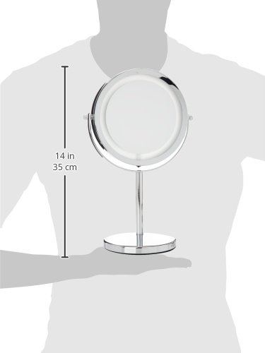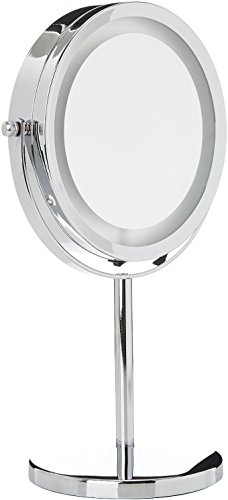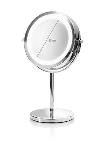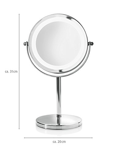 2in1 Kosmetikspiegel SHINE – (88550) Der praktische Standspiegel „Shine“ hilft Ihnen perfekt beim Schminken und der Gesichtspflege. Zwei drehbare Spiegelflächen (Ø 13 cm) sorgen dafür, dass Sie jede Partie Ihres Gesichts bestens im Blick haben – entweder ganz normal oder mit 5-facher Vergrößerung. Zusätzlich sind 16 LED-Lichter im Rahmen des Spiegels angebracht, die Ihnen mit ihrem hellen, weißen Licht unterstützend zur Seite stehen. Das Gestell und der sichere Standfuß des Spiegels sind aus hochwertig verchromtem, glänzendem Edelstahl gefertigt. Maße: H 31,5 x B 20,5 x T 13,5 cm. Inklusive Batterien.