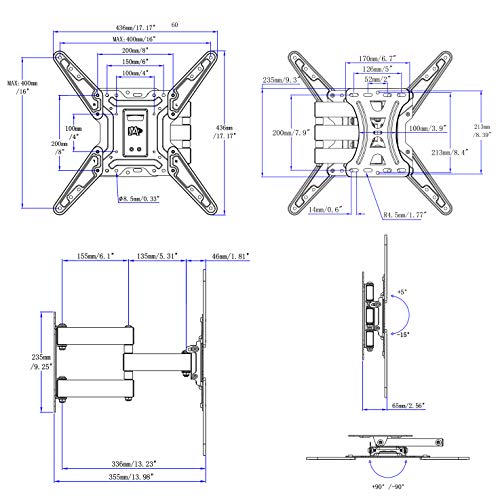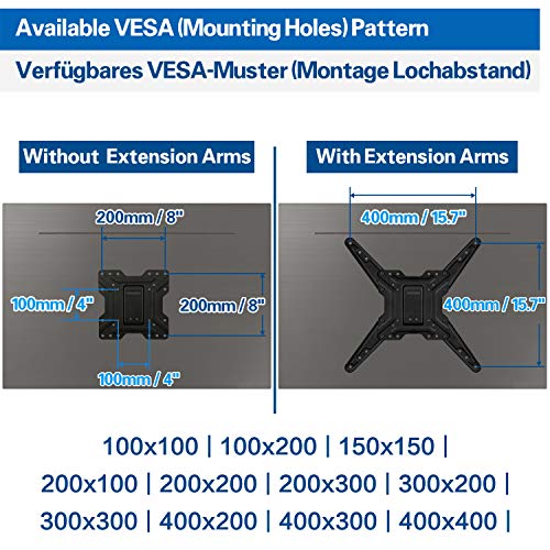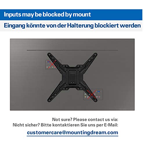 Mounting Dream TV Wandhalterung Schwenkbar Neigbar MD2431-MX-03Vorbeschriftete Installation Hardware inkl.:M8 Sechskant-Holzschrauben (4) Unterlegscheiben (4) 4mm Inbusschlüssel (1) Dübel (4) M4 x 12mm Schrauben (4) M4 x 30mm Schrauben (4) M6 x 12mm Schrauben (4) M6 x 35mm Schrauben (4) M8 x 25mm Schrauben (4) M8 x 50mm Schrauben (4) M4/M5 Unterlegscheiben (4) M6 Unterlegscheiben (4) M5/M6 (17mm) Abstandhalter (4) M8 (10mm) Abstandhalter (4) M8 (22mm) Abstandhalter (4) 2.5mm Abstandhalter (8) Spezifikationen: VESA-Kompatibilität: 100x100mm, 200x100mm, 200x200mm, 300x300mm, 400x200mm, 400x400mmTV-Größe: 26″ (66cm) – 55″ (140cm)Kompatible TV-Marke: Samsung, LG, Sony, Hisense, Blaupunkt, Grundig, JVC, Panasonic, Philips, Sharp, TCL, Telefunken, Toshiba, Changhong, JTC, Jaytech, Thomson, Xoro, Metz, Tristan, Auron, Reflexion, Loewe, Dyon, Orion, Technisat. (Abhängig von spezifischem Modell)Neigewinkel: + 5°/-15°Nivellierungseinstellung: ±5°Schwenkwinkel: ±90°Wandabstand: 65mm- 355mmAbmessungen der Wandplatte: 170mm (B) x 235mm (H) Kompatible Wandtype: Betonwand oder einzelner HolzpfostenKonstruktion: 100% Schwerlast-StahlGeschenke im Paket: 3-AchsenMagnetische Wasserwaage (1) Kabelbinder (3) für Kabel-Management