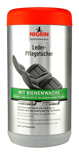 Sorgt für den Werterhalt von Glattleder Reinigt, pflegt und schützt in einem Arbeitsgang Für alle Lederoberflächen im Fahrzeug-Innenraum geeignet Wirkt farbauffrischend und schützt vor Neu-Verschmutzung Enthält Bienenwachs für zusätzlichen Schutz und ein seidenmatte Optik NIGRIN Performance Leder-Pflegetücher reinigen schonend und mühelos alle Lederoberflächen im Fahrzeug-Innenraum. Sie wirken farbauffrischend und schützen vor Neu-Verschmutzung. Enthält Bienenwachs für zusätzlichen Schutz und Pflege. Jedes Tuch bleibt feucht und frisch bis zur Entnahme dank des parktischen Flip-Top Deckels. Inhalt: 36 Tücher Vor der ersten Entnahme Deckel öffnen und Frische-Pack oben aufreißen Das erste Tuch durch die Entnahme-Öffnung des Deckels fädeln Deckel wieder aufsetzen Tuch entnehmen und verschmutzte Oberflächen abreiben Inhalt: 36 Tücher