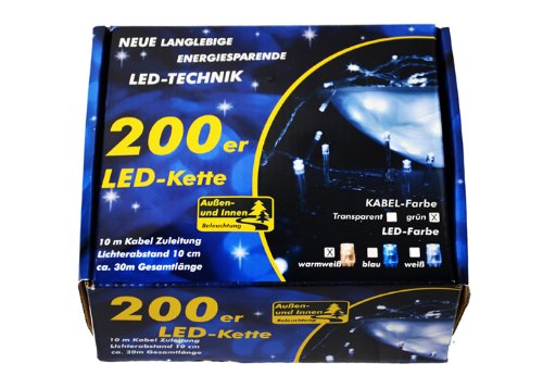 Nie wieder Lämpchen wechseln. Die LED-Technik macht`s möglich! Diese stromsparende Lichterkette ist sowohl als Innen-, wie auch als Außenbeleuchtung geeignet. Die LED Lämpchen haben den Vorteil, dass sie stoßfest sind und absolut keine Wärmeentwicklung stattfindet. Die wasserfeste Lichterkette können Sie im Innen- und Außenbereich anbringen. Setzen Sie Ihre eigenen Lichtakzente im Sommer wie im Winter und schmücken Sie Ihr Haus oder den Balkon, den Garten mit Ihrem Pavillon oder das Partyzelt. Den Gestaltungsmöglichkeiten sind keine Grenzen gesetzt. Mit dieser Lichterkette sparen Sie bis zu 80 % Energie gegenüber herkömmlichen Lampen! Das ist die Zukunft! Technische Daten: Trafo IP44 – 230 V / 30 V ~ 50 Hz – GS – geprüfte Sicherheit dunkelgrünes Kabel Lichterabstand ca. 10 cm Länge: ca. 10 Meter Zuleitung (Gesamtlänge ca. 28m) 200 LED´s weiß 3,0 V / 0,02 A = 12 W Energieverbrauch