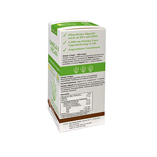NORSAN Omega-3 vegan flüssig PZN: 13476394Inhalt: 100mlNORSAN Omega-3 vegan flüssigNahrungsergänzungsmittelEin veganes Omega-3 Öl mit angenehmen GeschmackPflanzliches Algenöl aus nachhaltiger Kultivierung 2.000 mg Omega-3 pro Teelöffel (Tagesdosis) Reich an EPA und DHA Angenehmer Geschmack Pflanzliches Algenöl aus der Meeresmikroalge Schizochytrium sp. Nachhaltige und umweltschonende Kultivierung Biologisches Olivenöl als Antioxidans 100% Vegan Hochdosiert – Kein KonzentratDas Omega-3 Vegan besteht aus einem rein pflanzlichen Algenöl. Grundlage für das pflanzliche Omega-3 reiche Öl ist die Meeresmikroalge Schizochytrium sp. Diese Algenform zeichnet sich dadurch aus, dass sie sehr reich an den wertvollen marinen Omega-3-Fettsäuren EPA und DHA ist.Verzehrempfehlung:Täglich 5 ml (1 Teelöffel)Die geöffnete Flasche sollte innerhalb von 30 Tagen verbraucht werden.Informationen zum Hersteller:San Omega GmbHGubener Straße 4710243 Berlin